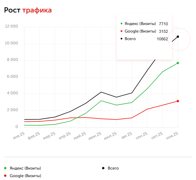 После внедрения новой системы и начала публикации статей, созданных с помощью ИИ, трафик показал устойчивую положительную динамику. С января по ноябрь 2025 года количество визитов выросло в 11,4 раза — с 963 до 10 991.