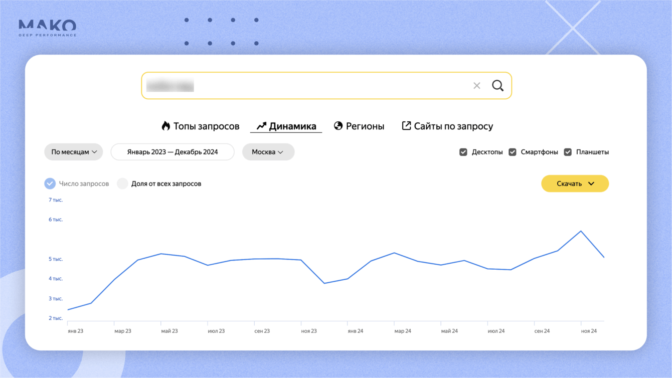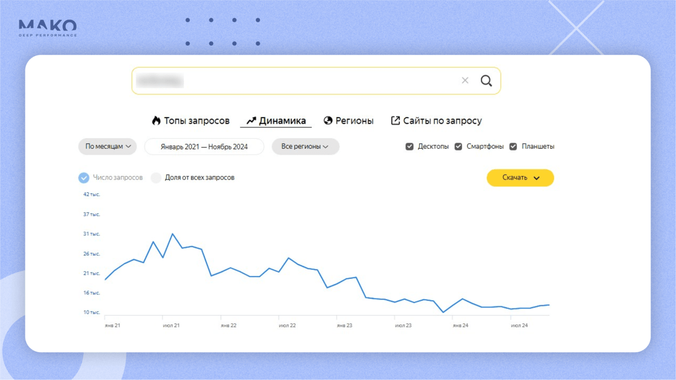 Мы проверили динамику органического брендового трафика на сайт и убедились, что клиент прав: с 2021 года переходы упали в 2-3 раза по сравнению с пиковыми значениями.