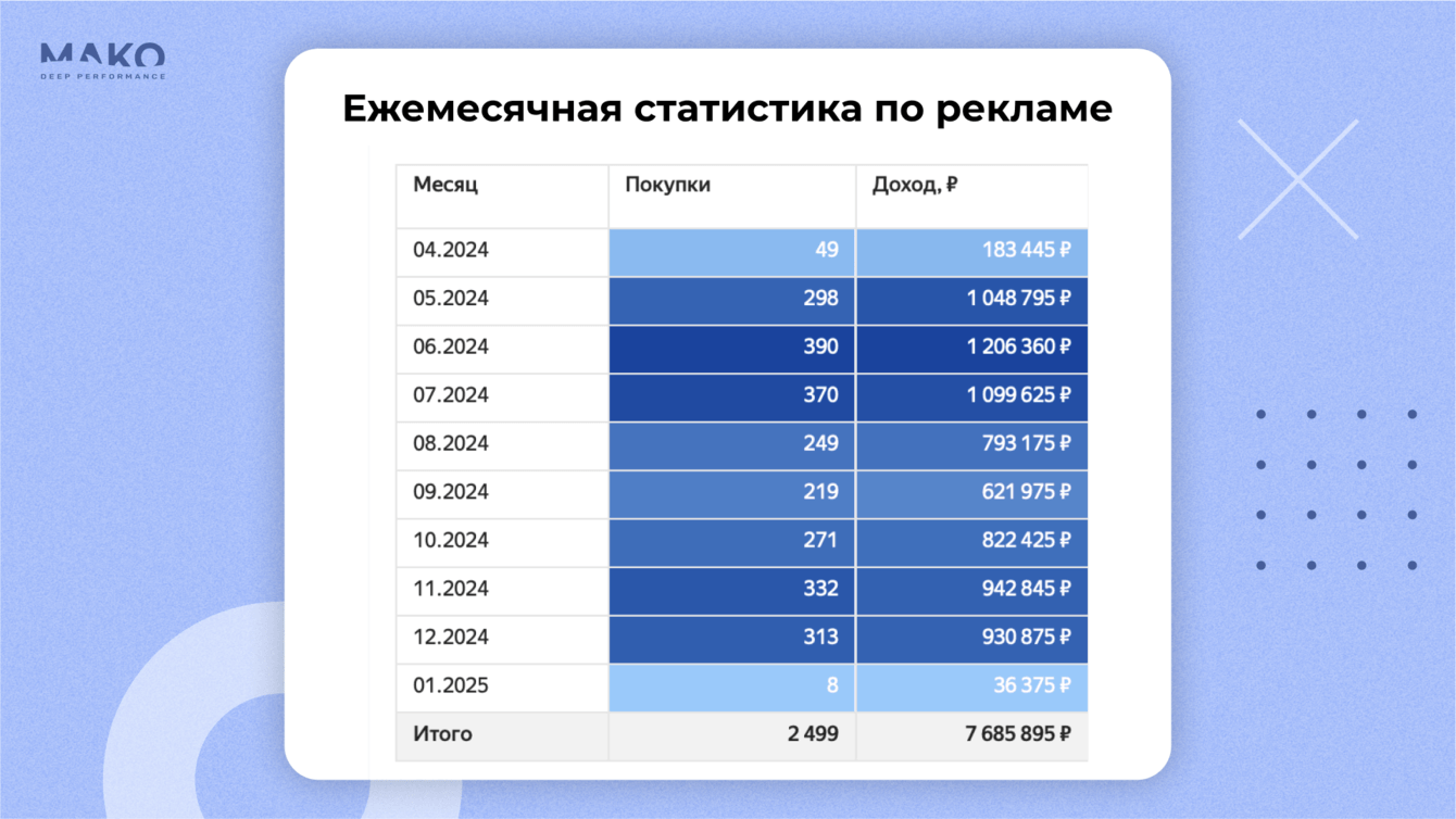 Стоимость клика оказалась вдвое ниже, чем у стандартной поисковой кампании ― 250 рублей вместо 500. Конверсия из клика в заявку составила 10% ― высокий показатель, потому что мы показывали рекламу уже теплой аудитории. За 9 месяцев мы получили 2500 продаж на общую сумму 7,7 млн рублей!