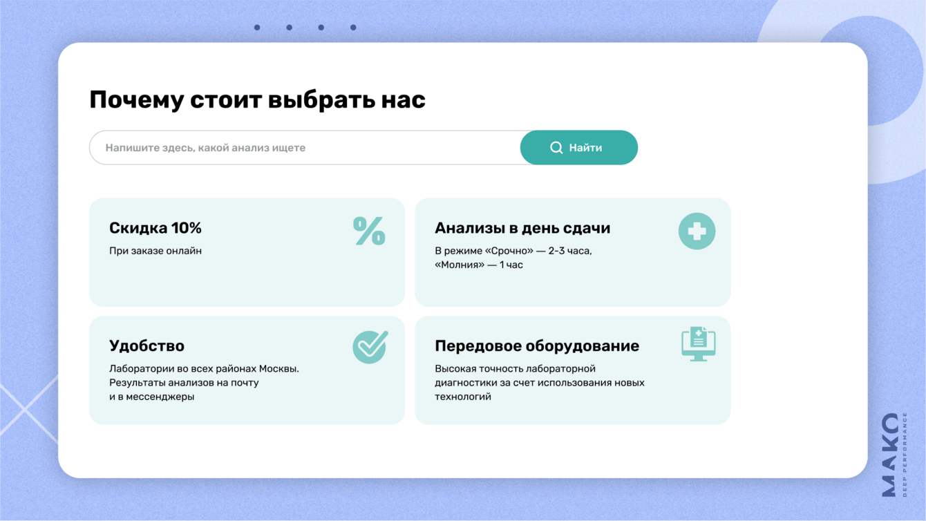 А в медицине доверие к бренду очень важно: люди вряд ли пойдут в незнакомую лабораторию, о которой до этого не слышали. Предпочтут агрегаторы или крупнейших игроков с лабораториями типа «Инвитро» или «Гемотест».