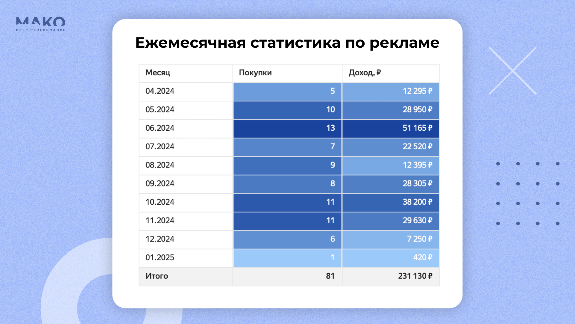 Окончательные выводы о влиянии рекламы на брендовый трафик можно будет делать весной, когда пройдет достаточно времени. Но уже сейчас можно сказать, что помимо медийного эффекта есть и другой результат ― post-view конверсии, то есть реальные целевые действия пользователей на сайте после контакта с рекламой. За 2 месяца из этого источника было 444 продажи на общую сумму 1 649 600 рублей.