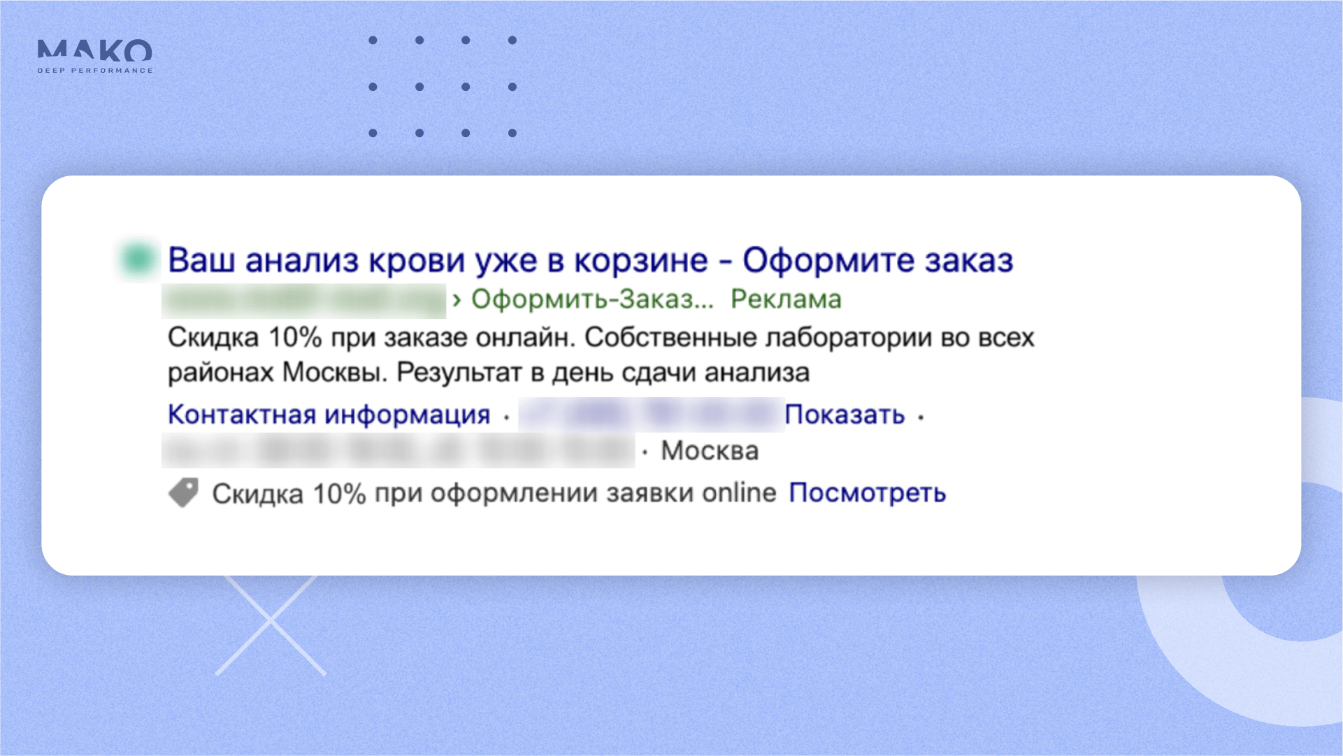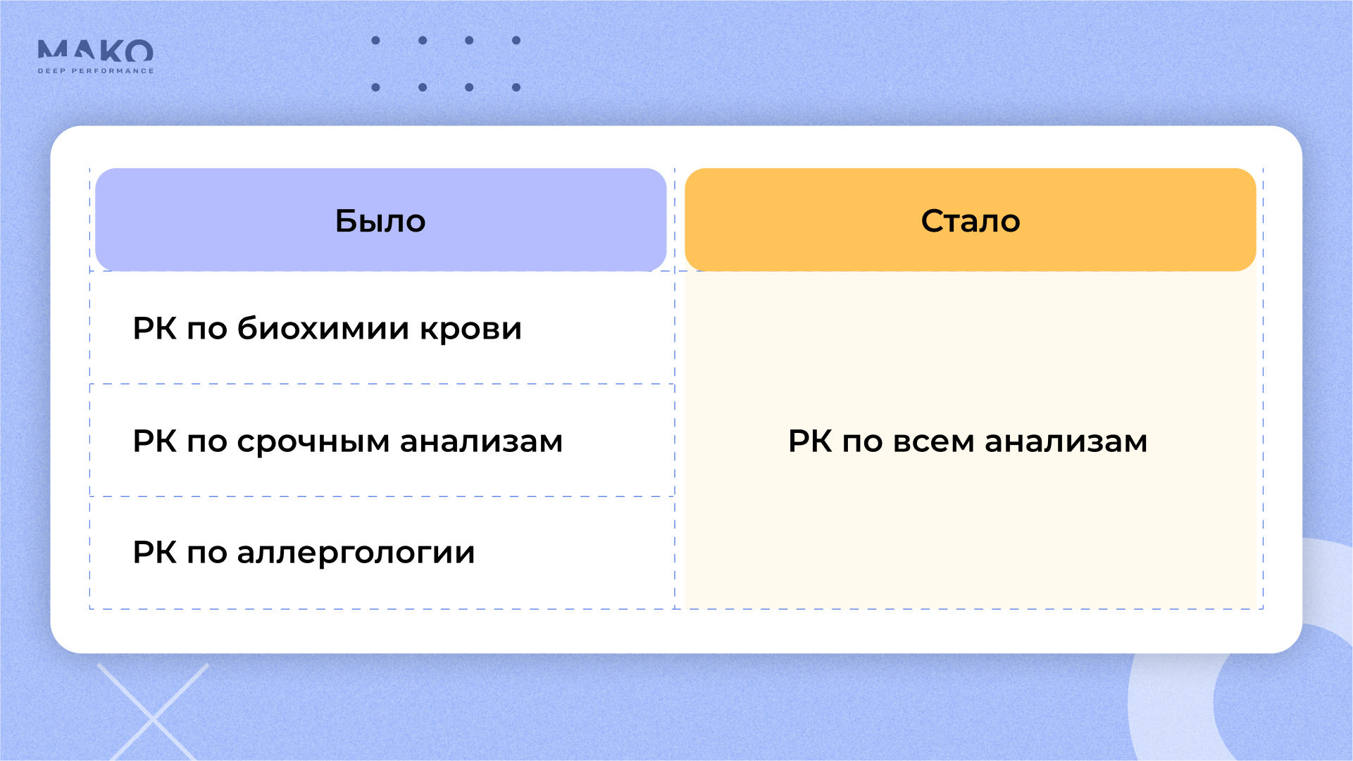 Дальше нужно было что-то решать с классической рекламой на поиске. До нас эти кампании были убыточными. Возникла дилемма. С одной стороны, полностью отключать рекламу на поиске нежелательно: в медицинской тематике это основной источник лидов. Во многих случаях анализы ― услуга экстренного спроса, которую ищут здесь и сейчас, вводя в строку поисковика что-то вроде «общий анализ крови Москва».
