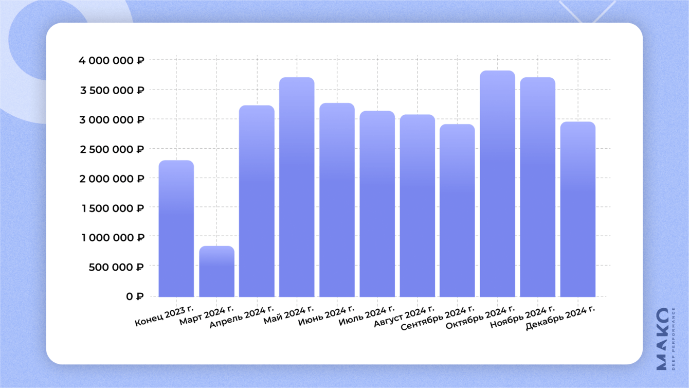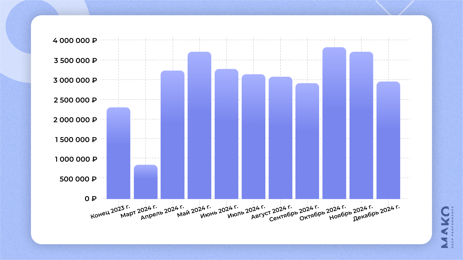 Мы начали искать, куда утекает рекламный бюджет, если продажи не растут. Обнаружили аномалию: в декабре 2023 года стоимость клика упала более чем в 2 раза по сравнению с ноябрем ― с 53 до 23 рублей. По некоторым кампаниям клики вообще стоили 3-5 рублей. Сайт стало заливать дешевым трафиком ― число визитов увеличилось вдвое. Но продажи выросли не так значительно, всего на 300 тыс. рублей.