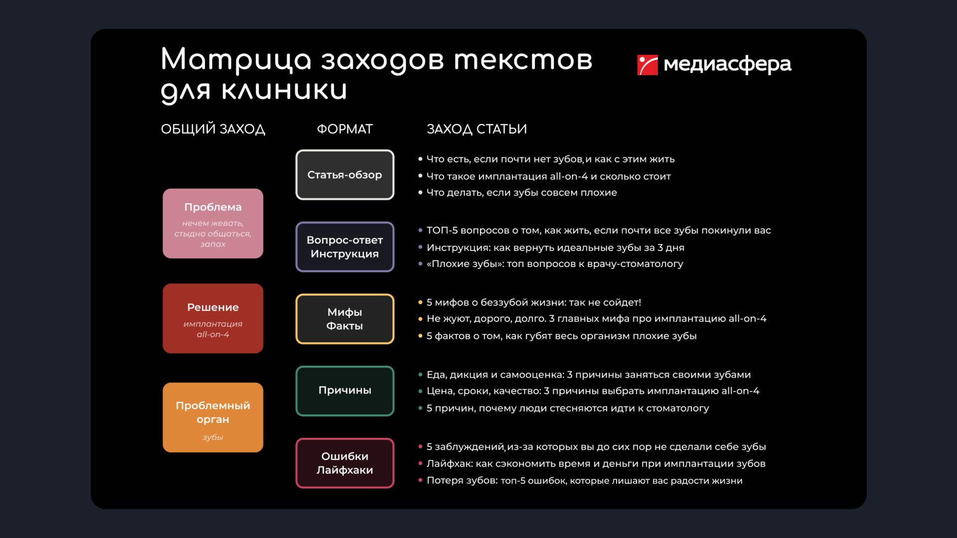 В случае с клиникой доктора Севака место царь-статьи заняла статья с разбором глубинных причин боязни стоматологов. Для ПромоСтраниц мы переписывали её много раз, руководствуясь матрицей заходов.