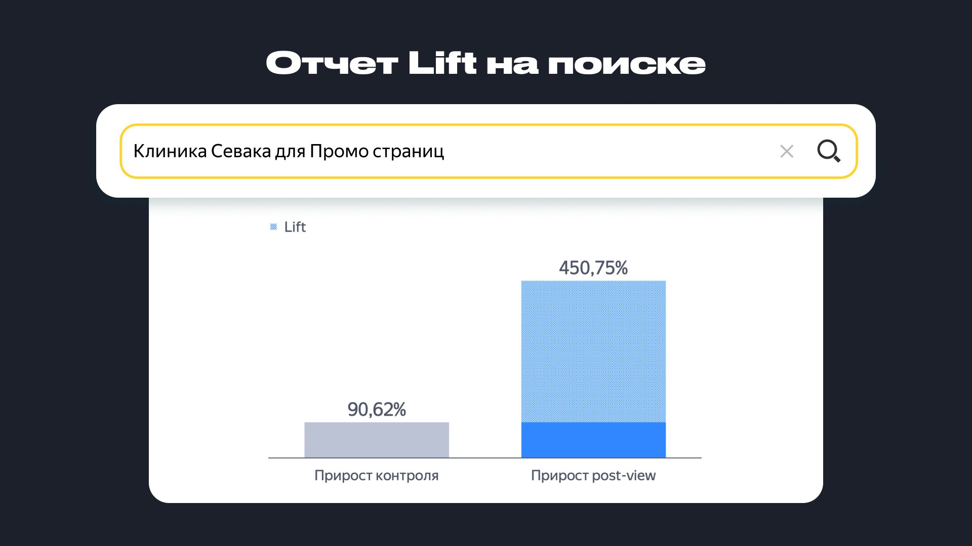 Анализ эффективности, проведённый Яндексом, показал дополнительные преимущества инструмента: +90,62% — прирост интереса к бренду клиники доктора Севака за счёт всей маркетинговой активности, кроме ПромоСтраниц. И +450% — прирост интереса к бренду исключительно за счёт ПромоСтраниц.
