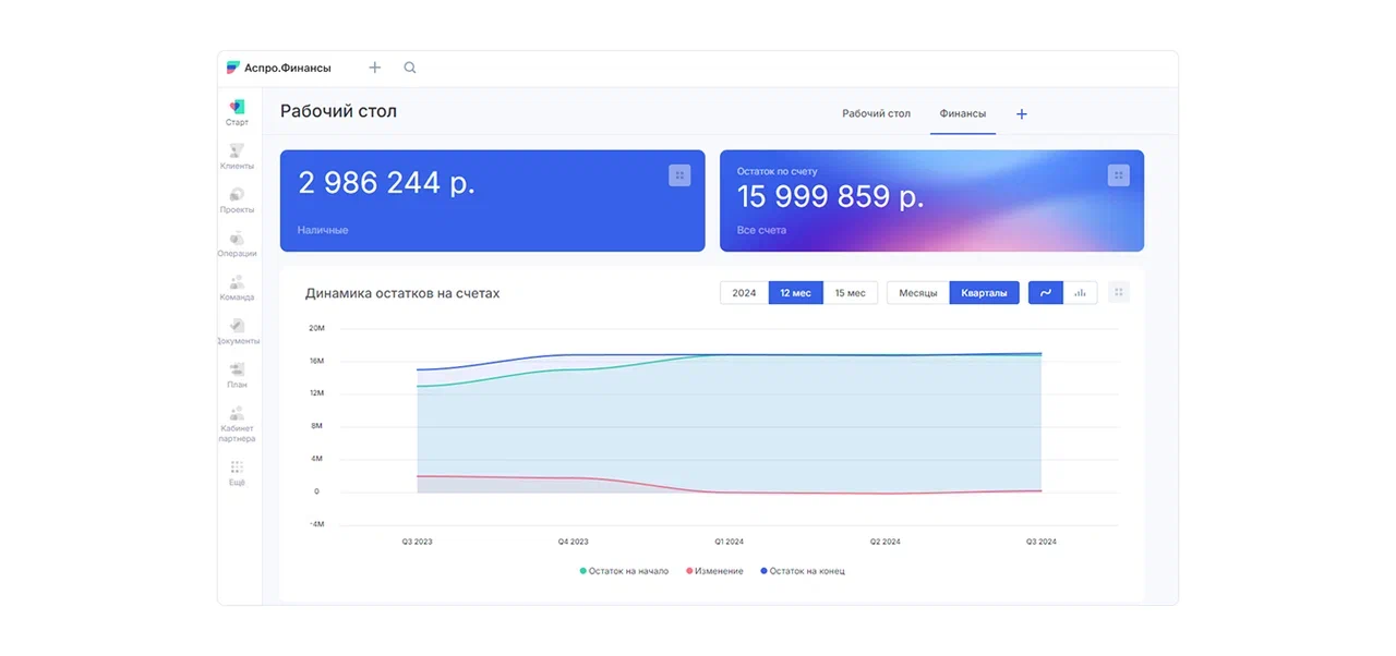 В Аспро.Финансы можно смотреть остатки по каждому счету и видеть общую сумму — как в валюте счета, так и в базовой валюте компании. Это решило проблему с разрозненными данными.