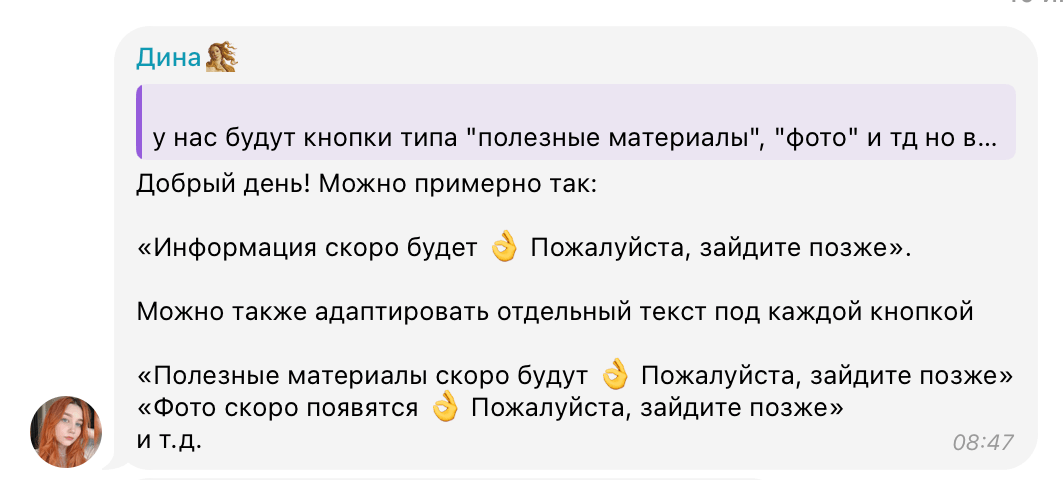 Порой нам прилетали задачи, которые нужно было сделать день в день. Например, написать пост, рассылку, отредачить небольшую статью. Чтобы ускорить процесс, мы решили общаться напрямую с экспертами. Всех, кто принимает участие в написании и согласовании текстов, собрали в одном чате в Telegram.