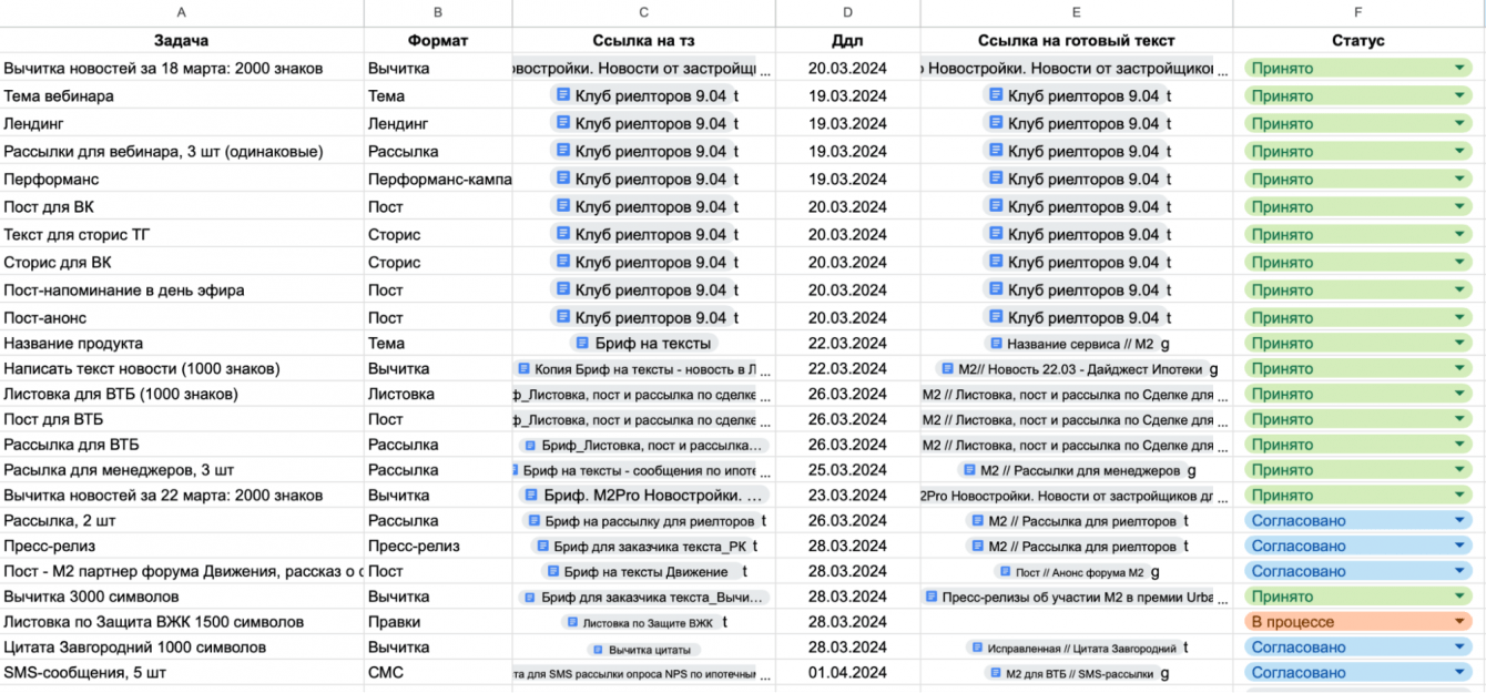 Статусы и дедлайны по всем задачам отслеживали в Гугл-таблице, чтобы ничего не затерялось в чате
