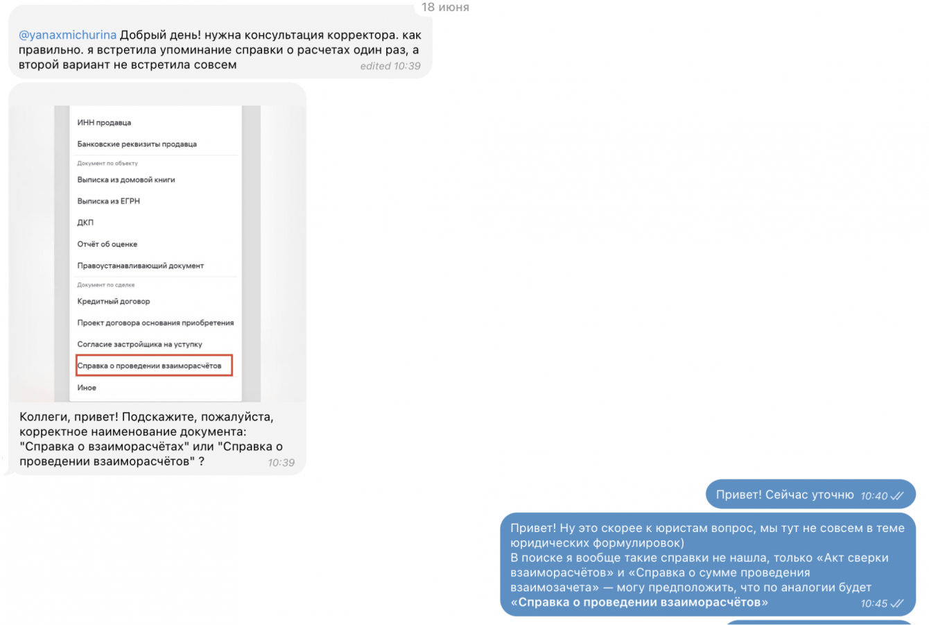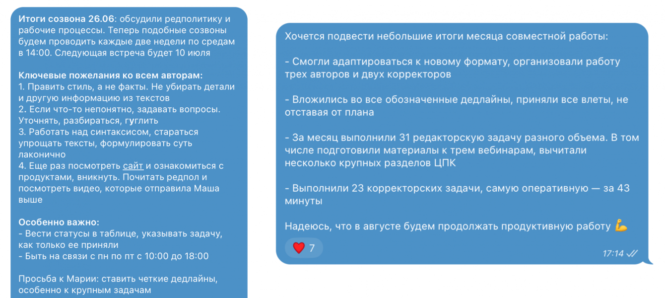 После созвона редактор отписывался о договорённостях, а раз в месяц подводил итоги по выполненным работам в чате