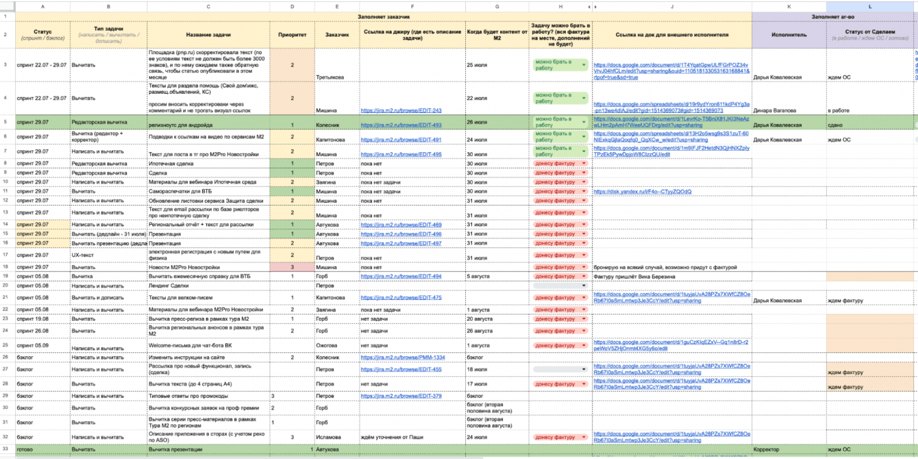 Саму таблицу собрали менеджеры М2, а мы исправно её вели и следили за статусами