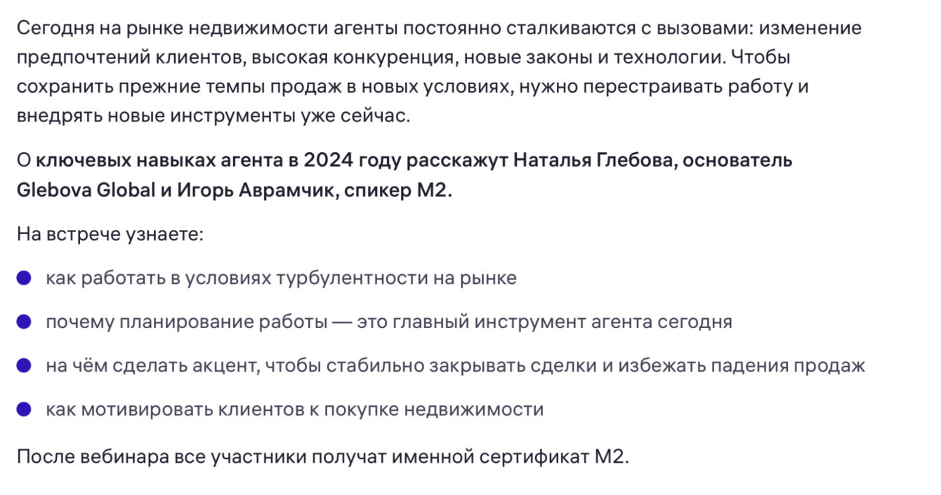 М2 активно работают с контентом. У них есть свои медиа про недвижимость, несколько Telegram-каналов: для физических лиц, для риелторов и про работу с новостройками. Ещё они регулярно проводят обучающие мероприятия с участием экспертов в сфере недвижимости. Например, на вебинарах в «Клубе риелторов» рассказывают, как меняются тренды на рынке за последний квартал, какие выходят постановления и как риелтору удерживать клиентов.