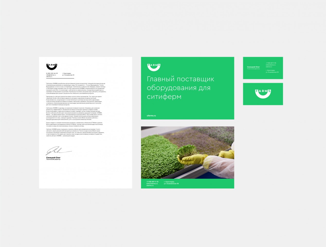 Задача заключалась в разработке фирменного стиля для UFarms — компании, которая специализируется на производстве промышленного оборудования для агропредприятий и городских ферм. Основной целью было создать образ, который подчеркивает высокую технологичность, надежность и экологичность оборудования, а также показывает приверженность к инновациям в сфере сельского хозяйства и устойчивого развития.
