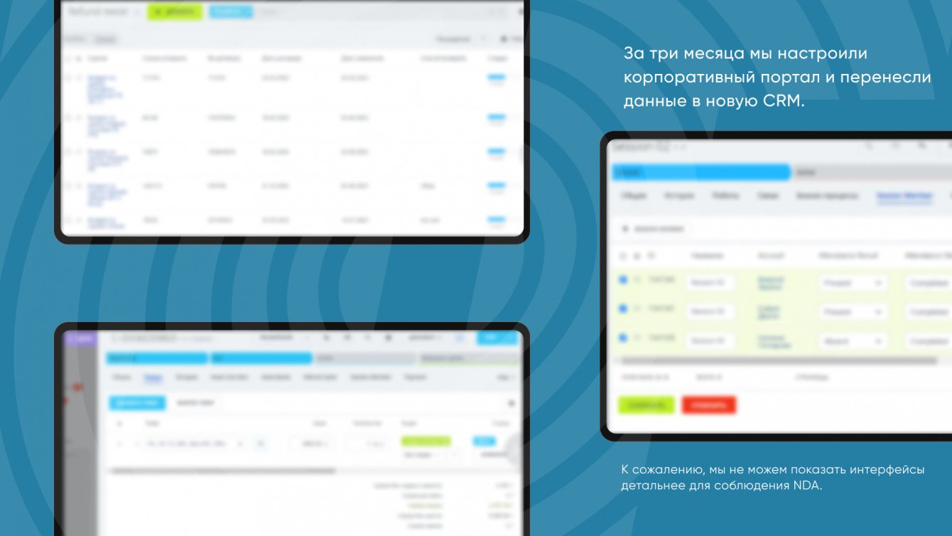 В кратчайший срок – три месяца, мы развернули и настроили корпоративный портал и перенесли данные в новую CRM, что дало возможность компании продолжать свою деятельность.