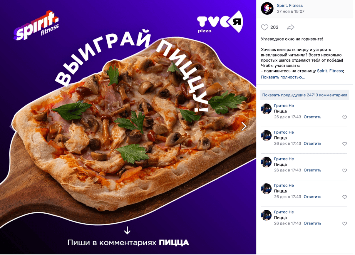 После реализации оффлайн-активации запустили розыгрыш пиццы в социальных сетях брендах через игровой формат. Надо было подписаться на соц.сети брендов, а также оставить комментарий Пицца. Потом бот присылал в ответ сборную пиццу и если пицца правильно собиралась в картинку, то пользователь получал приз. Пост с розыгрышем собрал 24 713 комментариев и 15к просмотров. А в самом розыгрыше приняло участие 5000 человек.