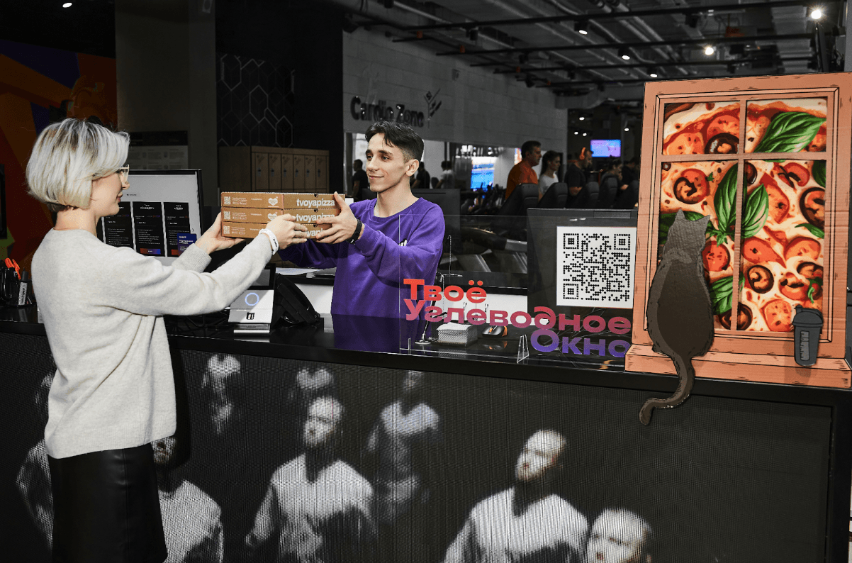 После анонса необычных рецептов мы объявили о создании уникальной услуги: только в Spirit. Fitness можно было получить «Твою» чит-мил пиццу, не покидая фитнес-клуба, чтобы оперативно закрыть углеводное окно. В одном из филиалов мы оборудовали брендированную зону выдачи, чтобы посеять знание о коллаборации среди посетителей клуба, а также предложили им поучаствовать в розыгрыше пиццы оффлайн и онлайн. В остальных филиалах разместили наклейки с QR-кодами, по которым можно было сделать заказ.
