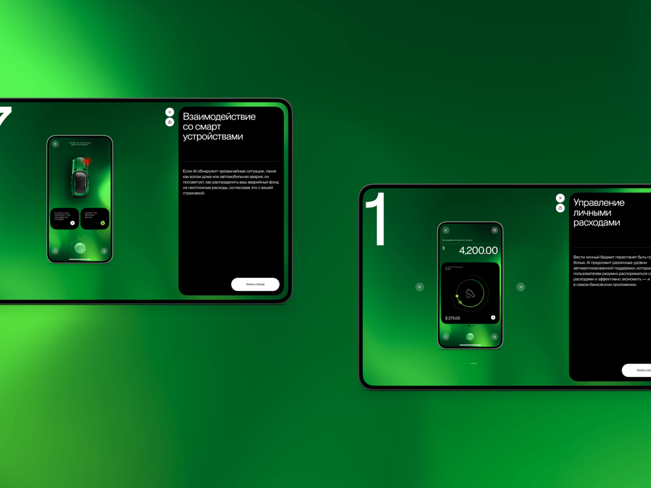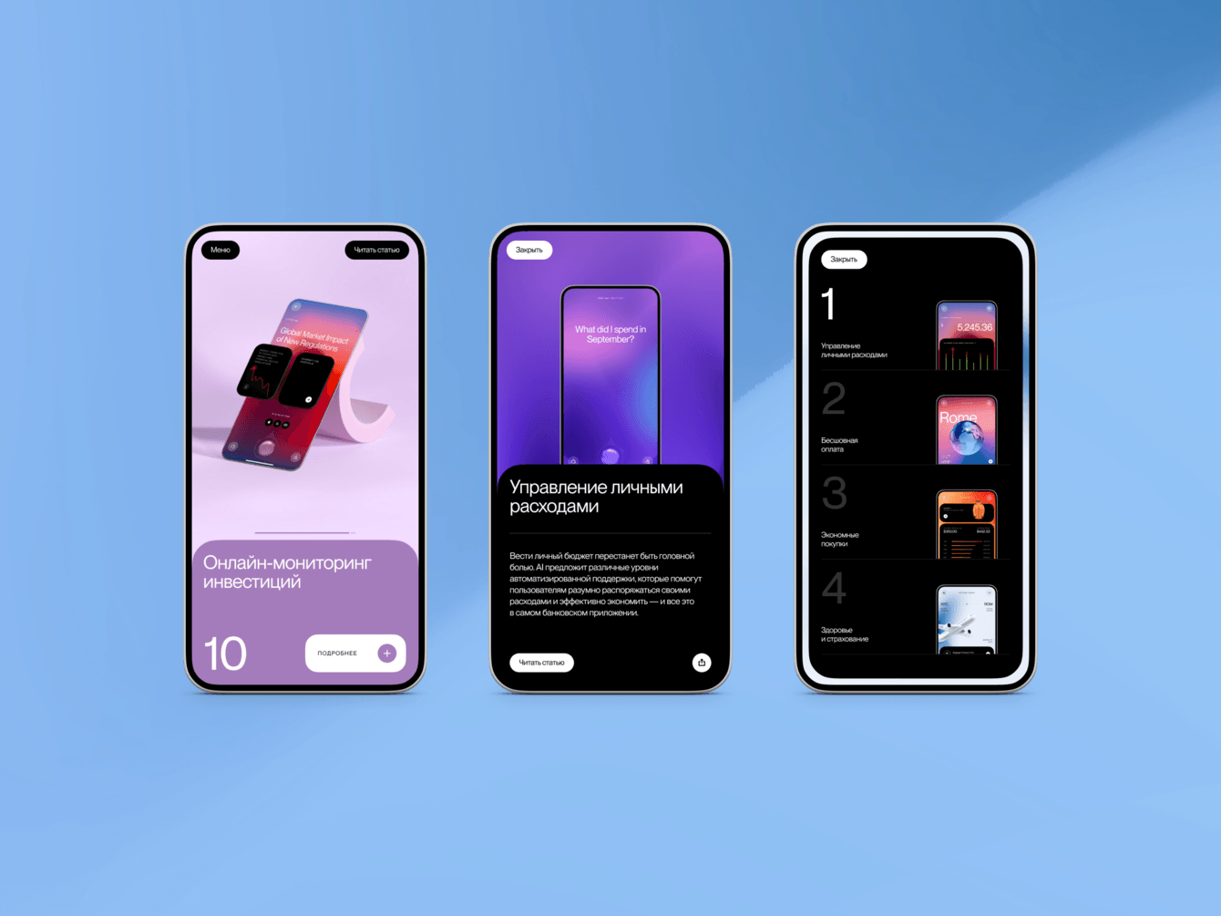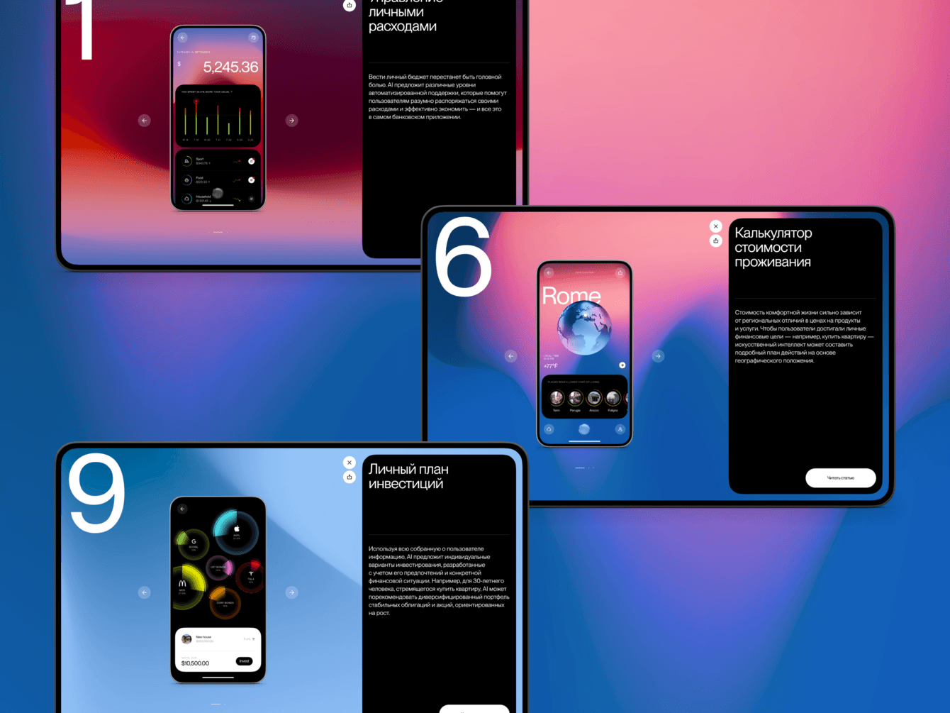2. Для каждой разработали дизайн интерфейса, в котором нейросети переплетаются с актуальными трендами финтеха.