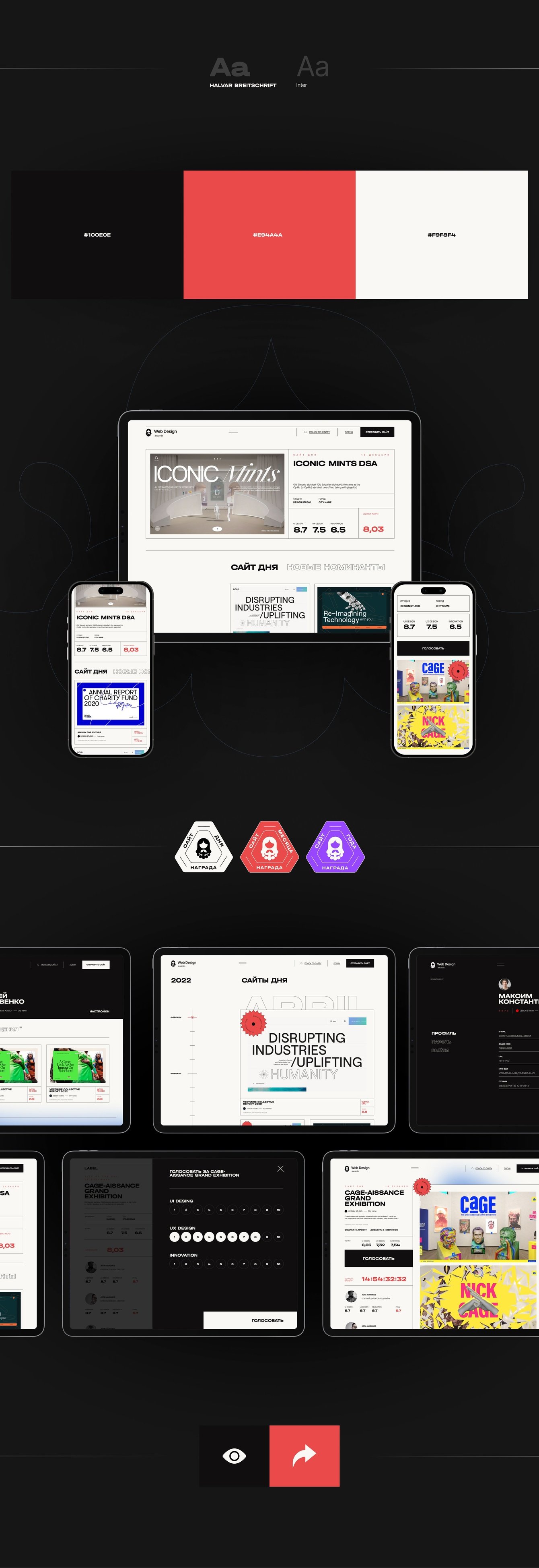 Web Design Awards — новый российский конкурс сайтов, цель которого отметить и наградить лучшие работы в сфере веб-дизайна. Миссия проекта заключается в том, чтобы создать платформу, на которой дизайнеры смогут публиковать свои работы, получать обратную связь от коллег и находить вдохновение. Наша задача — разработать систему, которая гармонично сочетала бы в себе современную визуальную часть, а также максимально удобный и функциональный интерфейс, чтобы все группы целевой аудитории смогли интуитивно решать свои задачи.