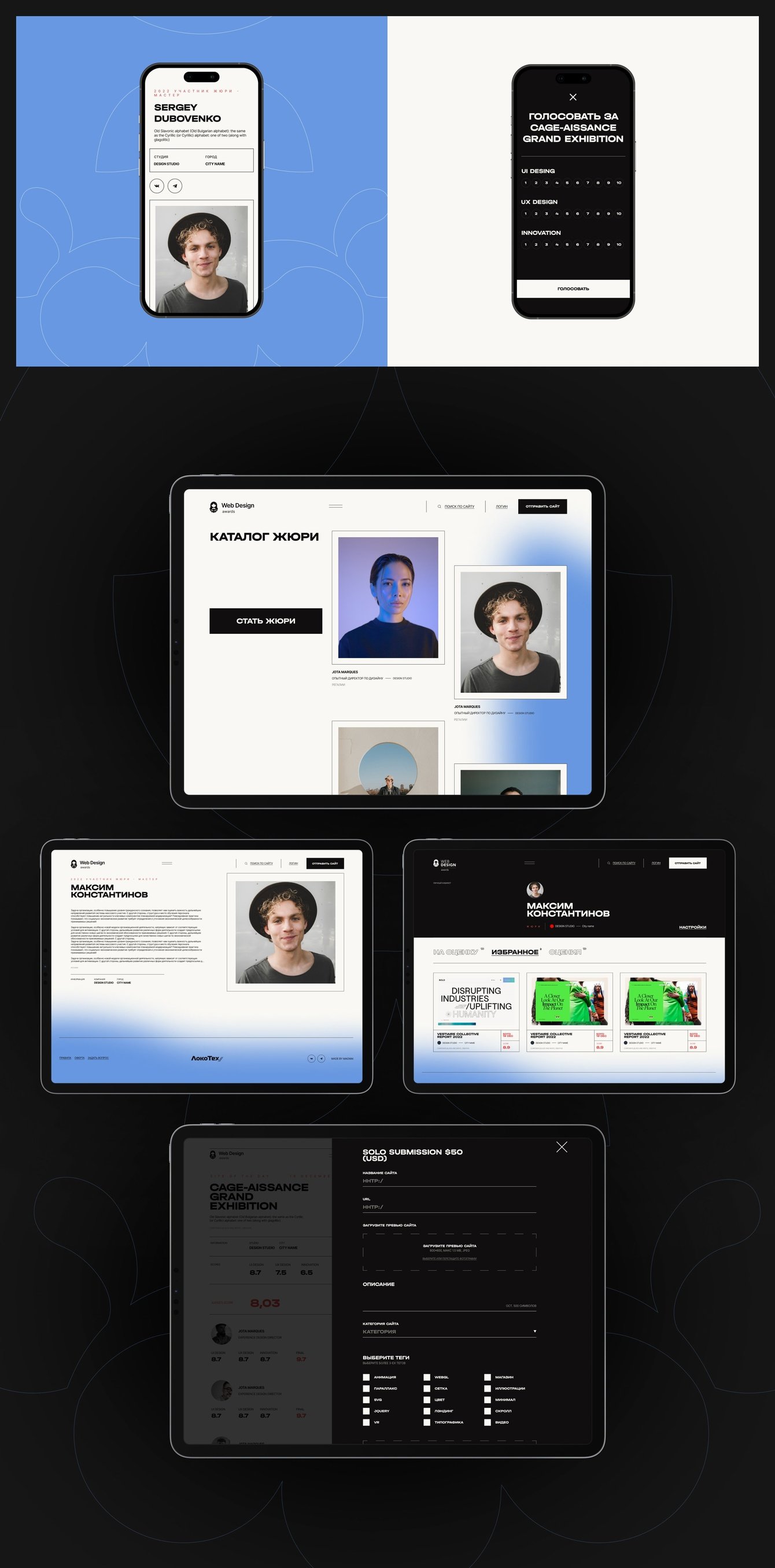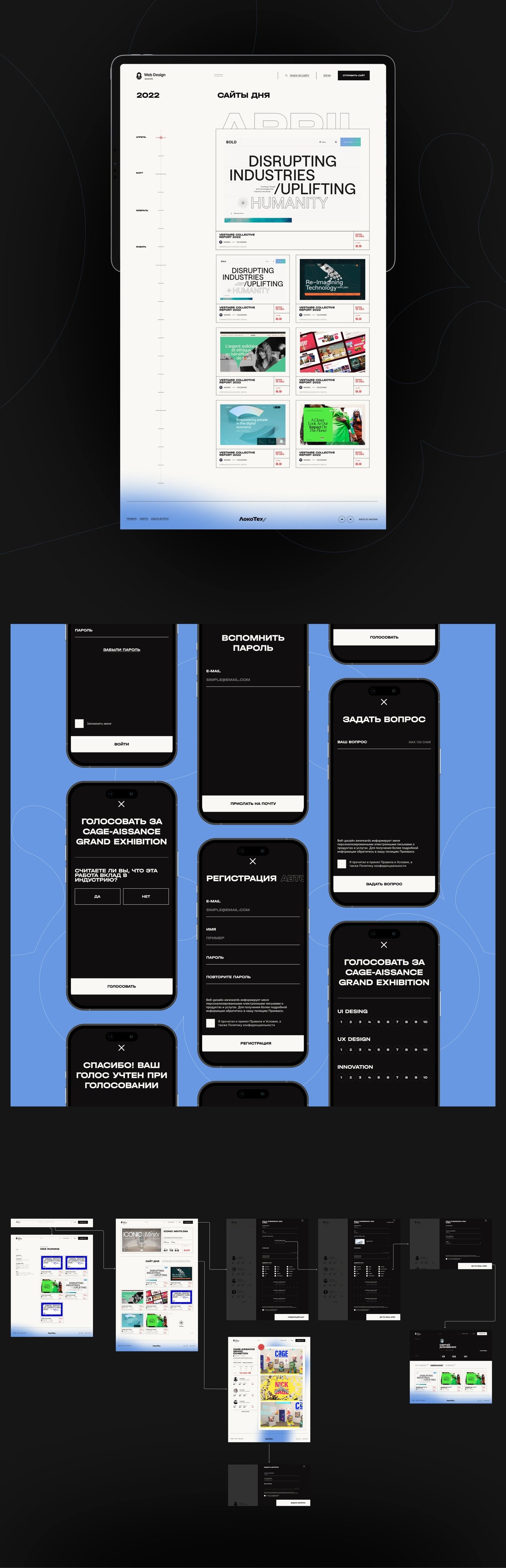 Помимо общей канвы важно было продумать все точки входа для каждой роли. Есть несколько путей, по которым идут пользователи: главная страница, каталог, карточка работы, личный кабинет, а также целая система голосования.