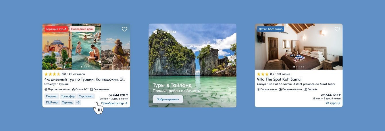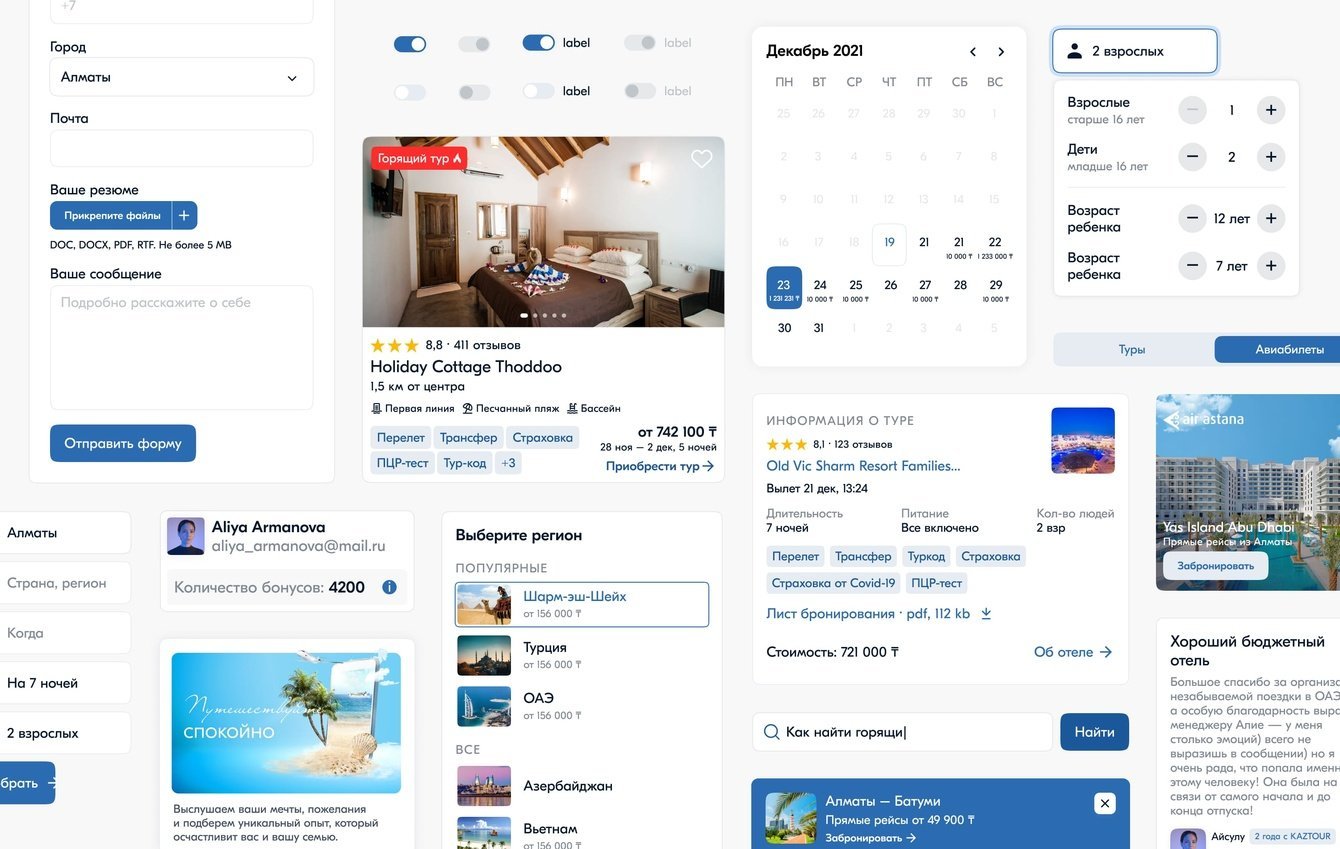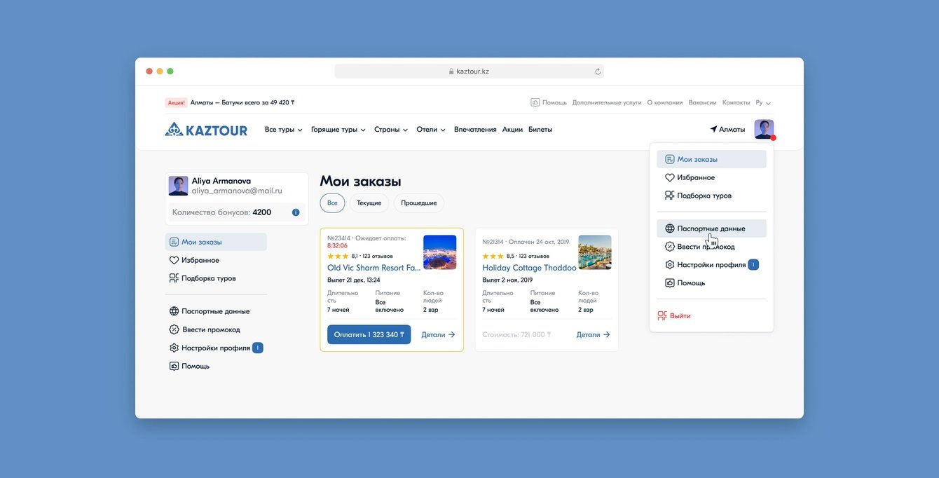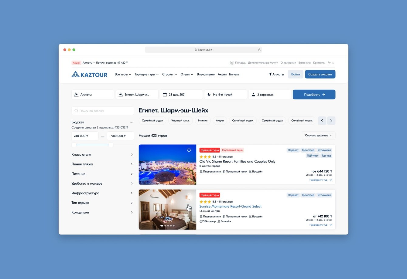 Kaztour — одно из старейших турагентств Казахстана. Чтобы помочь компании выйти на цифровой travel-рынок, в «Ракетной фирме» спроектировали дизайн нового веб-сервиса. Несмотря на то, что в этом проекте нашей задачей был только дизайн, объем работы получился по-настоящему большим. В рамках проекта мы задизайнили ~70 уникальных экранов сервиса и 35 дополнительных состояний.