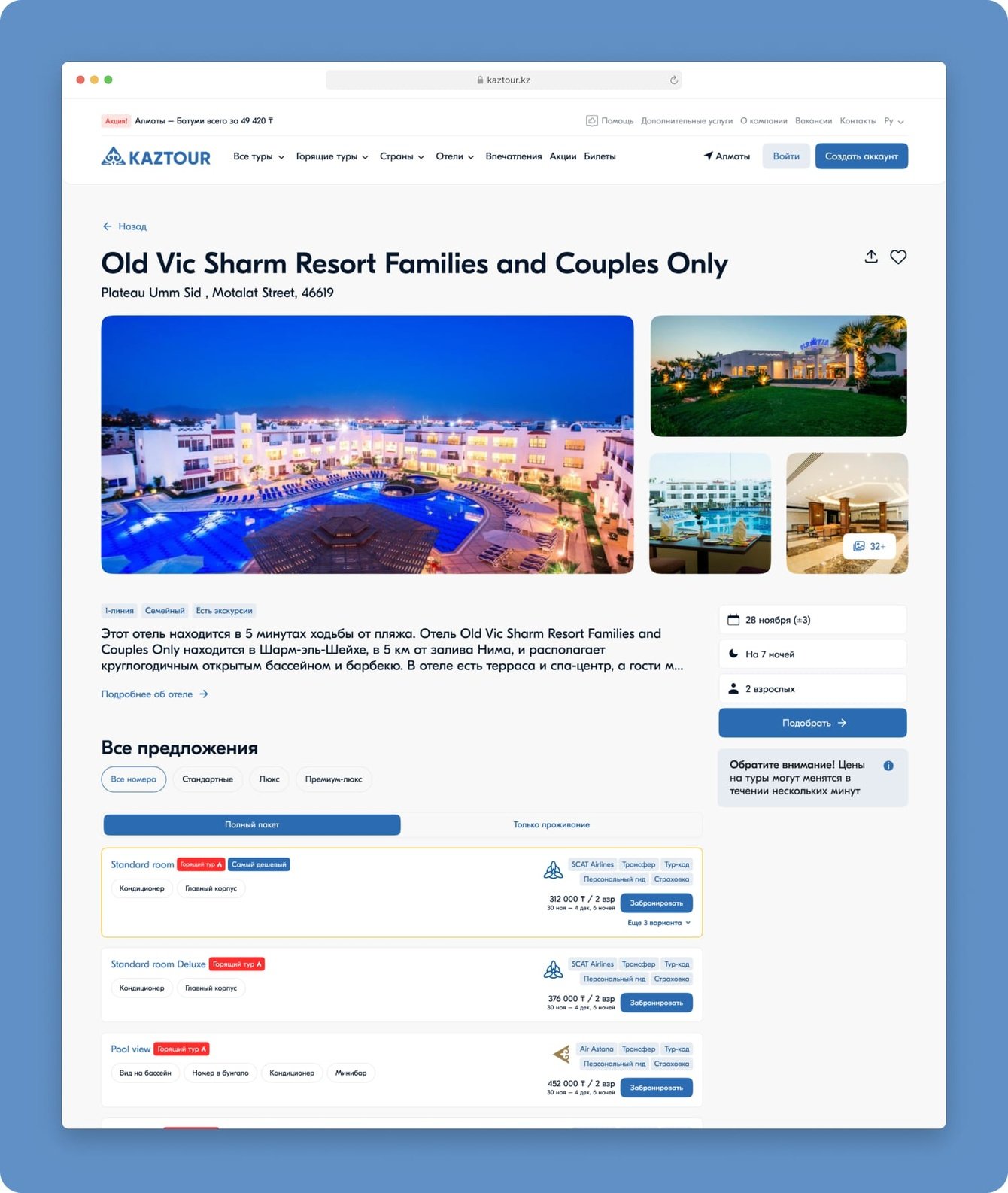 Страница тура снабжена всей необходимой информацией о возможностях отеля, опциях и ценах. Все блоки, текст и функциональность подаются спокойно и не борются друг с другом за внимание посетителя сайта.