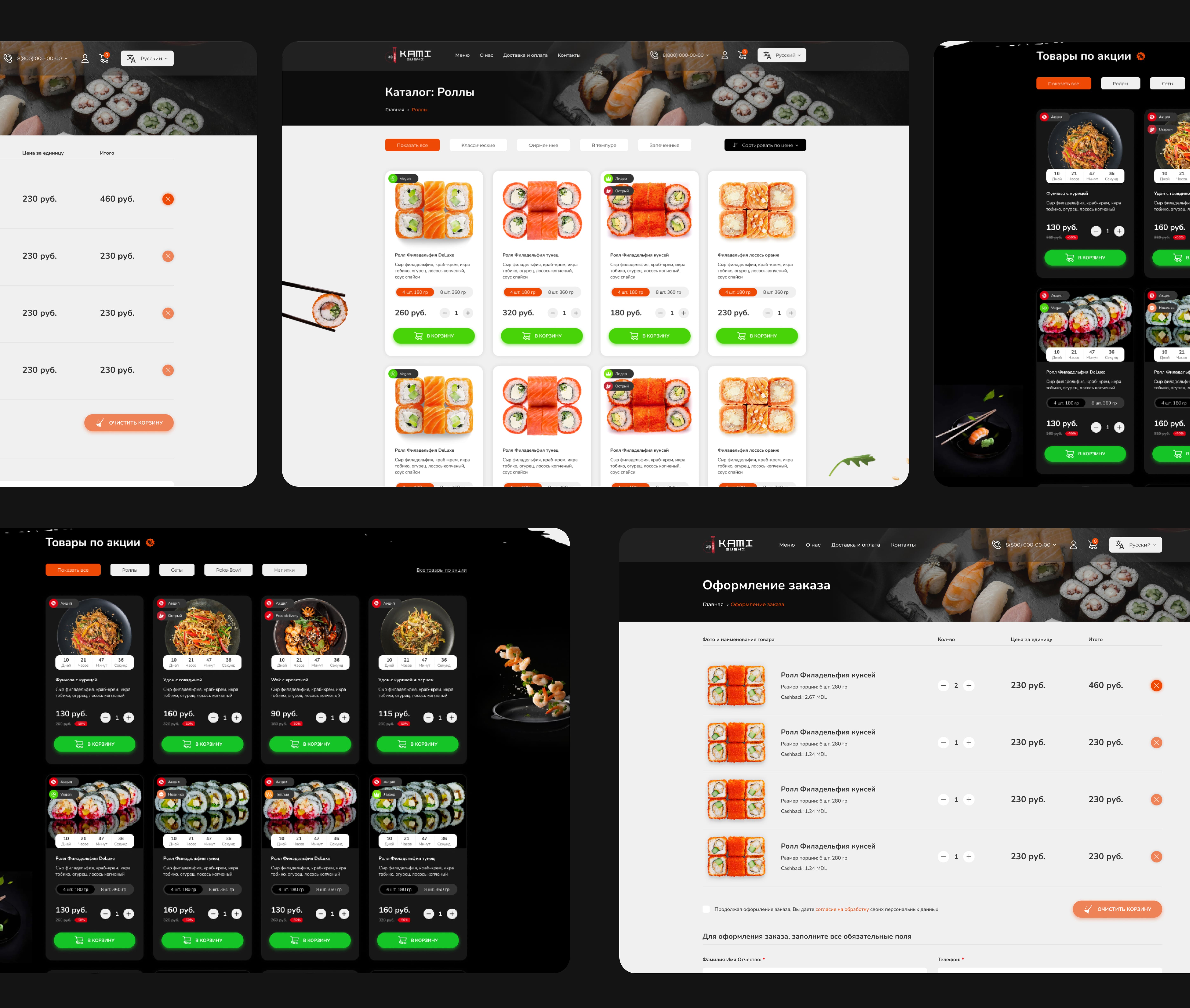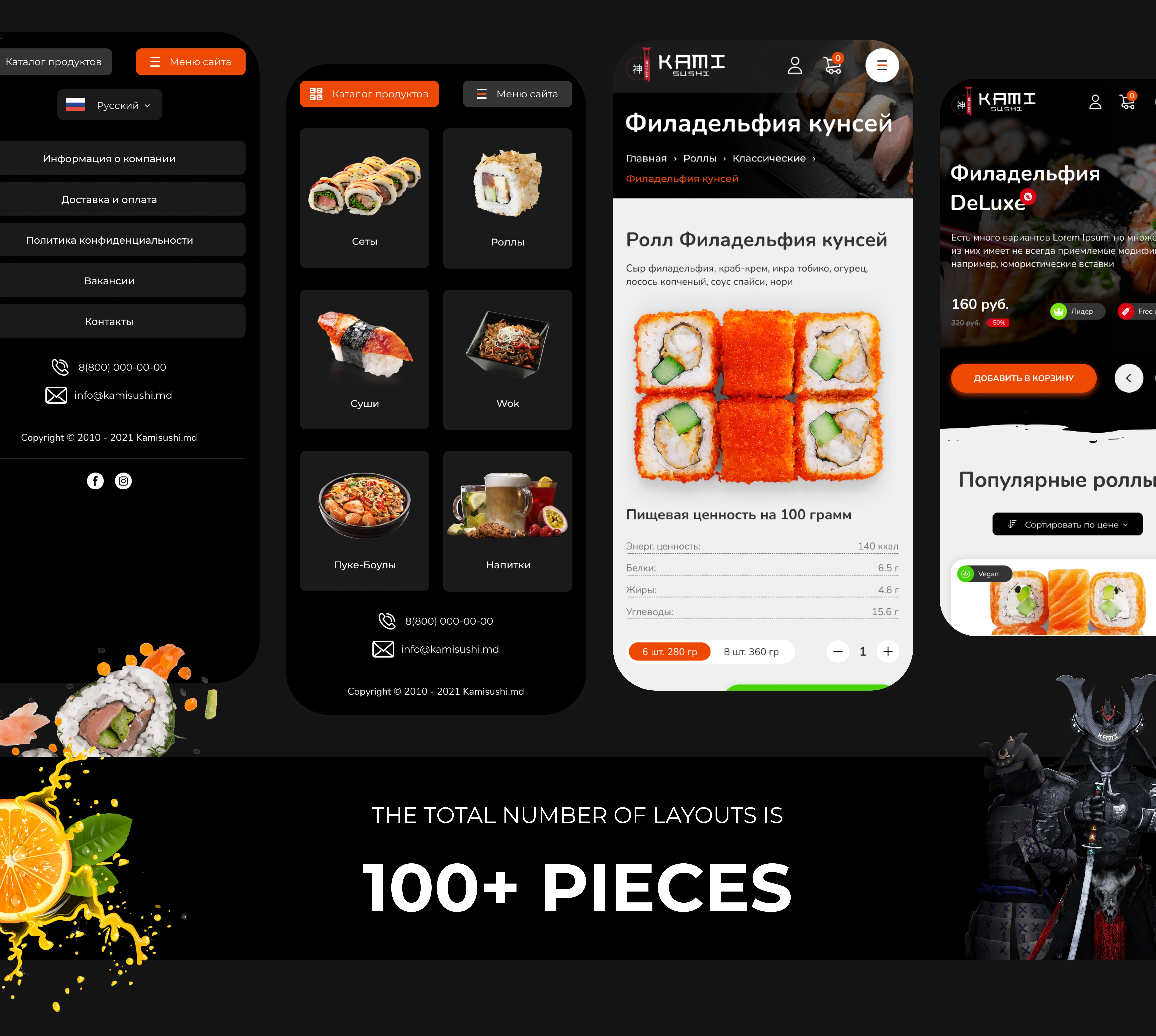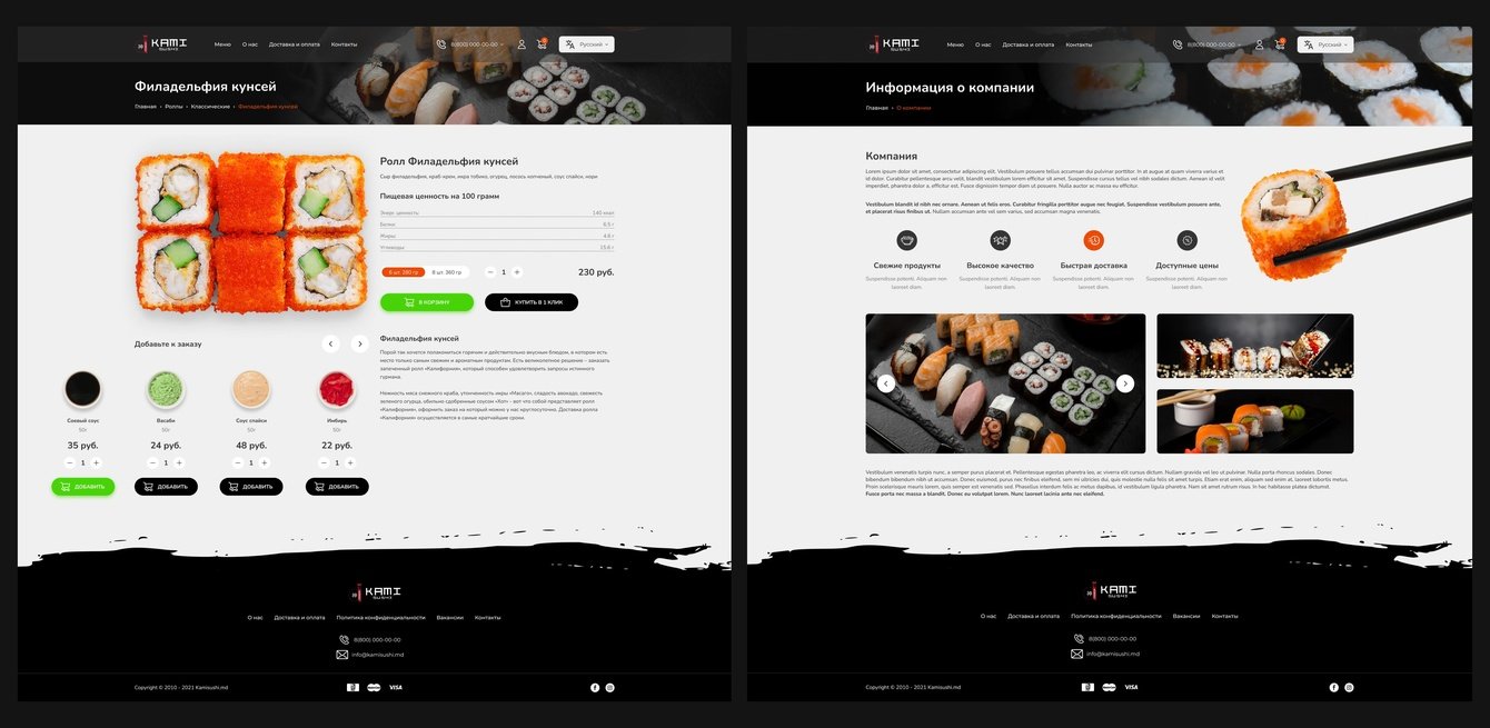 Разработать уникальный дизайн для ресторана Японской кухни с удобным и понятным UX. Сайт функционирует как e-commerce, все страницы соответствуют полноценному интернет-магазину.