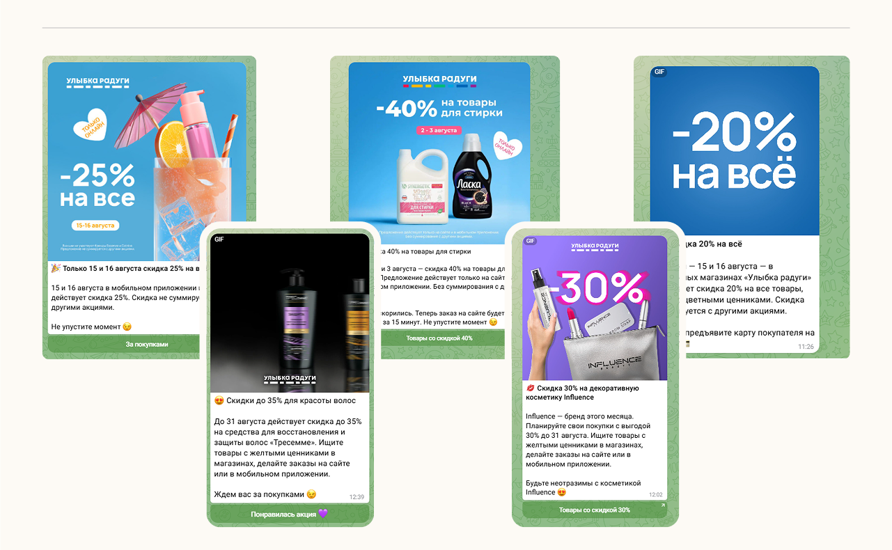 Мессенджеры — это хороший канал информирования о скидках. Люди хотят получать только сообщения о том, какие предложения актуальны сегодня, чтобы принять решение, зайти в магазин сегодня вечером или нет.