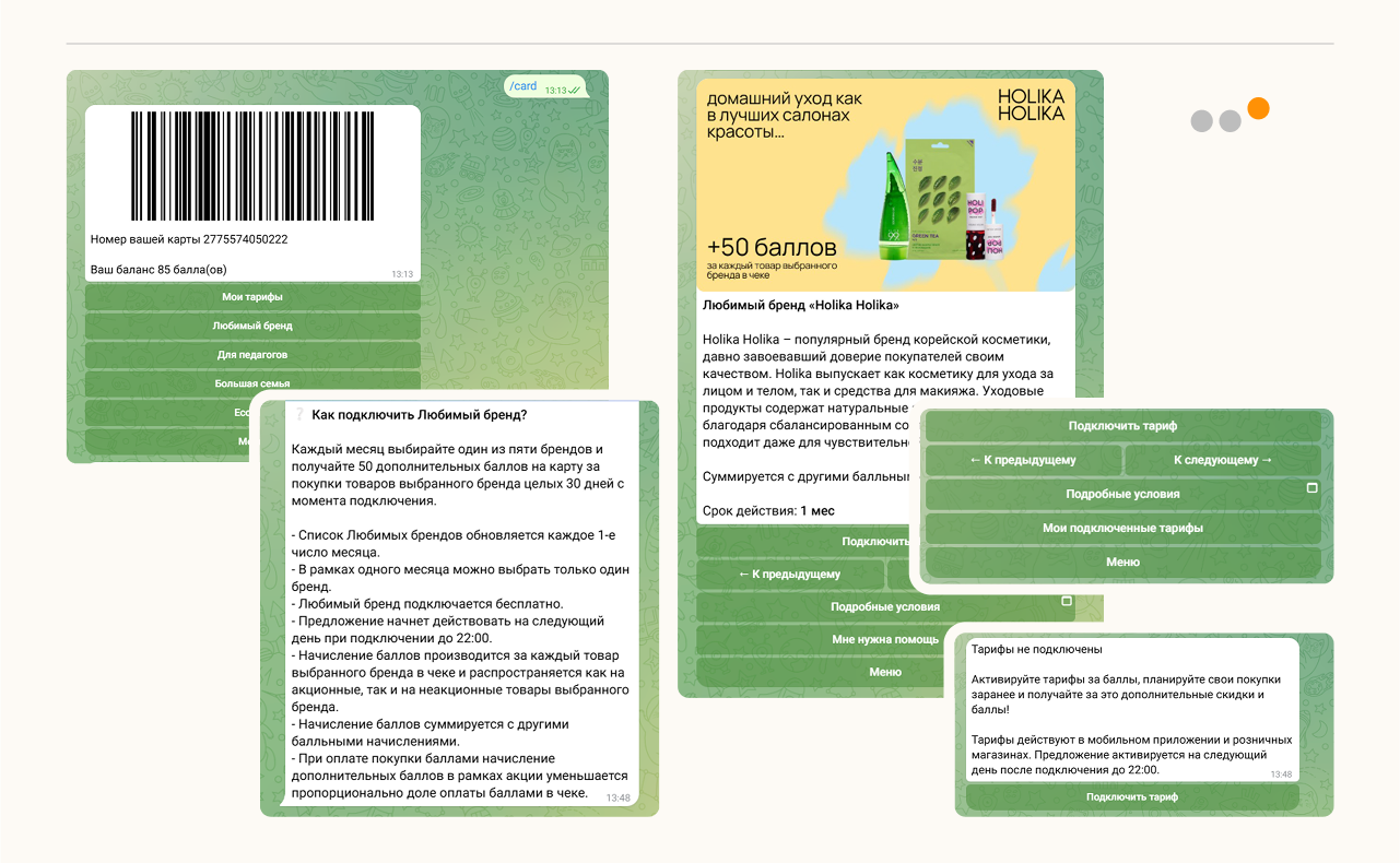 Часть клиентов предпочитает пользоваться Программой лояльности в чат-боте → дали им простую альтернативу мобильному приложению, в которой есть все основные возможности программы лояльности.