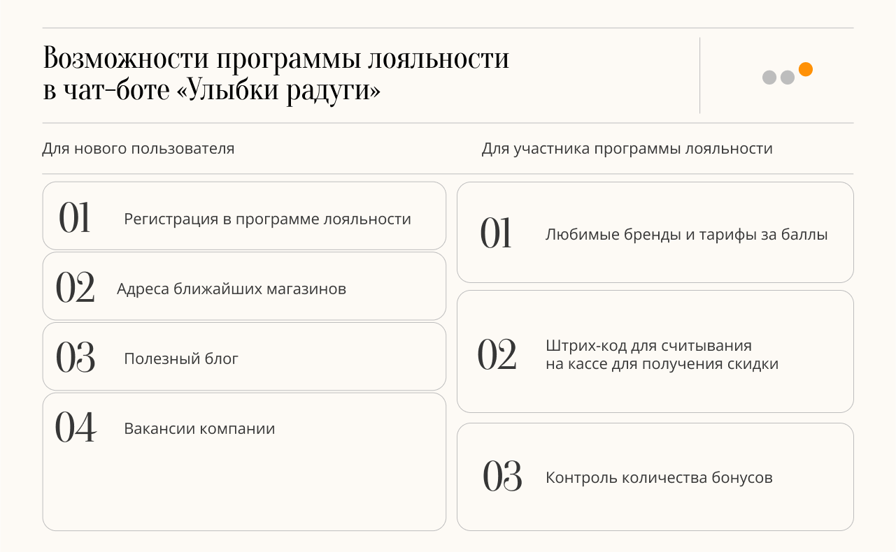 В мессенджере клиенты «Улыбки радуги» могут полнофункционально пользоваться Программой лояльности. Опыт «Улыбки радуги» показывает, что не всем удобно мобильное приложение, и чат-бот в мессенджере для них является удобной альтернативой. При этом его разработка и поддержка обходится дешевле.