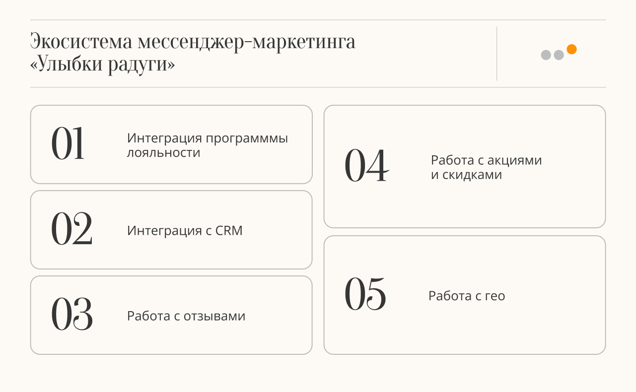 «Улыбка радуги» хочет понимать, как подписчики мессенджеров взаимодействуют с брендом → через интеграцию с программой лояльности выстроили систему, которая позволяет отслеживать покупки онлайн и офлайн, выстраивать по полученным данным систему аналитики.