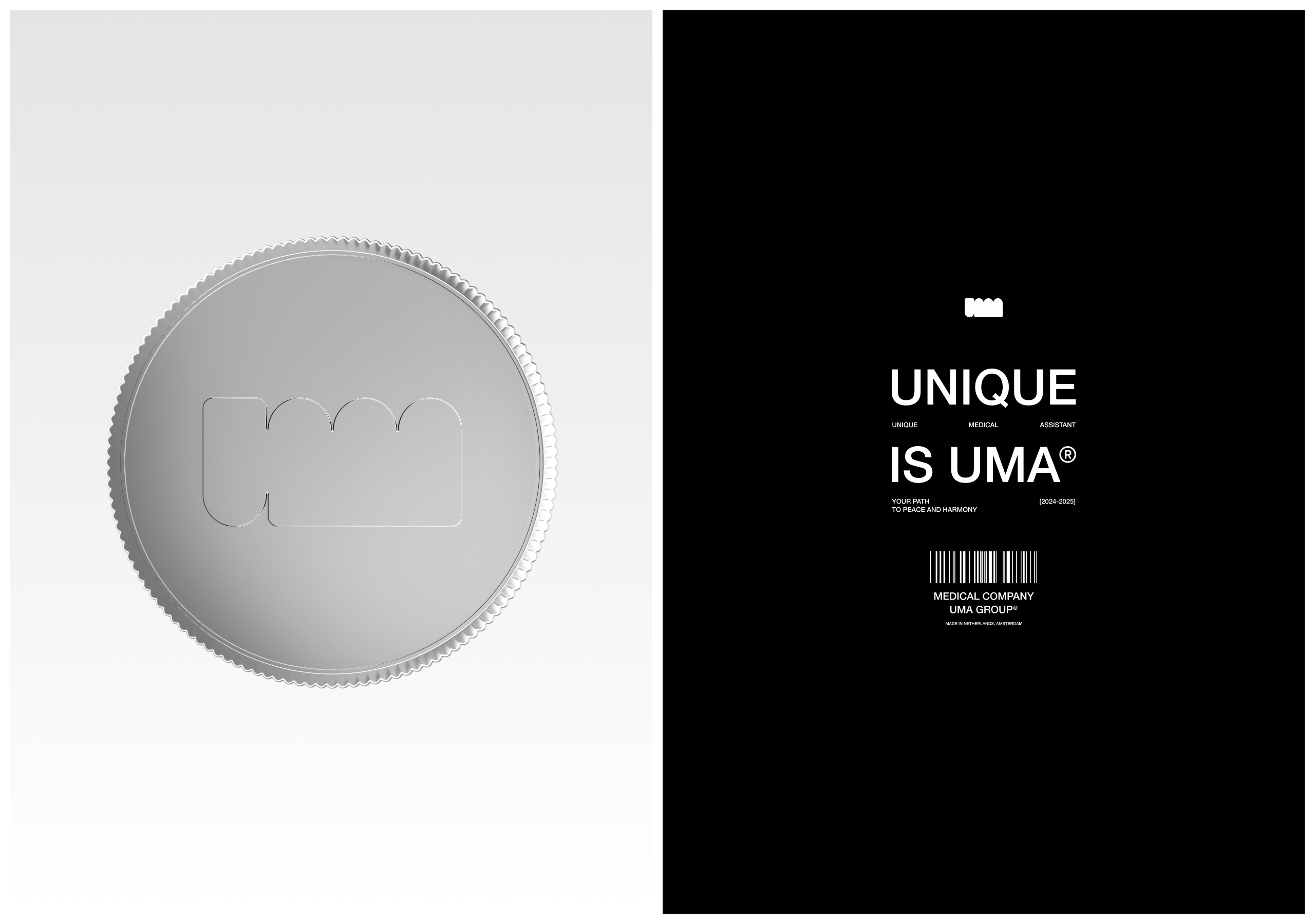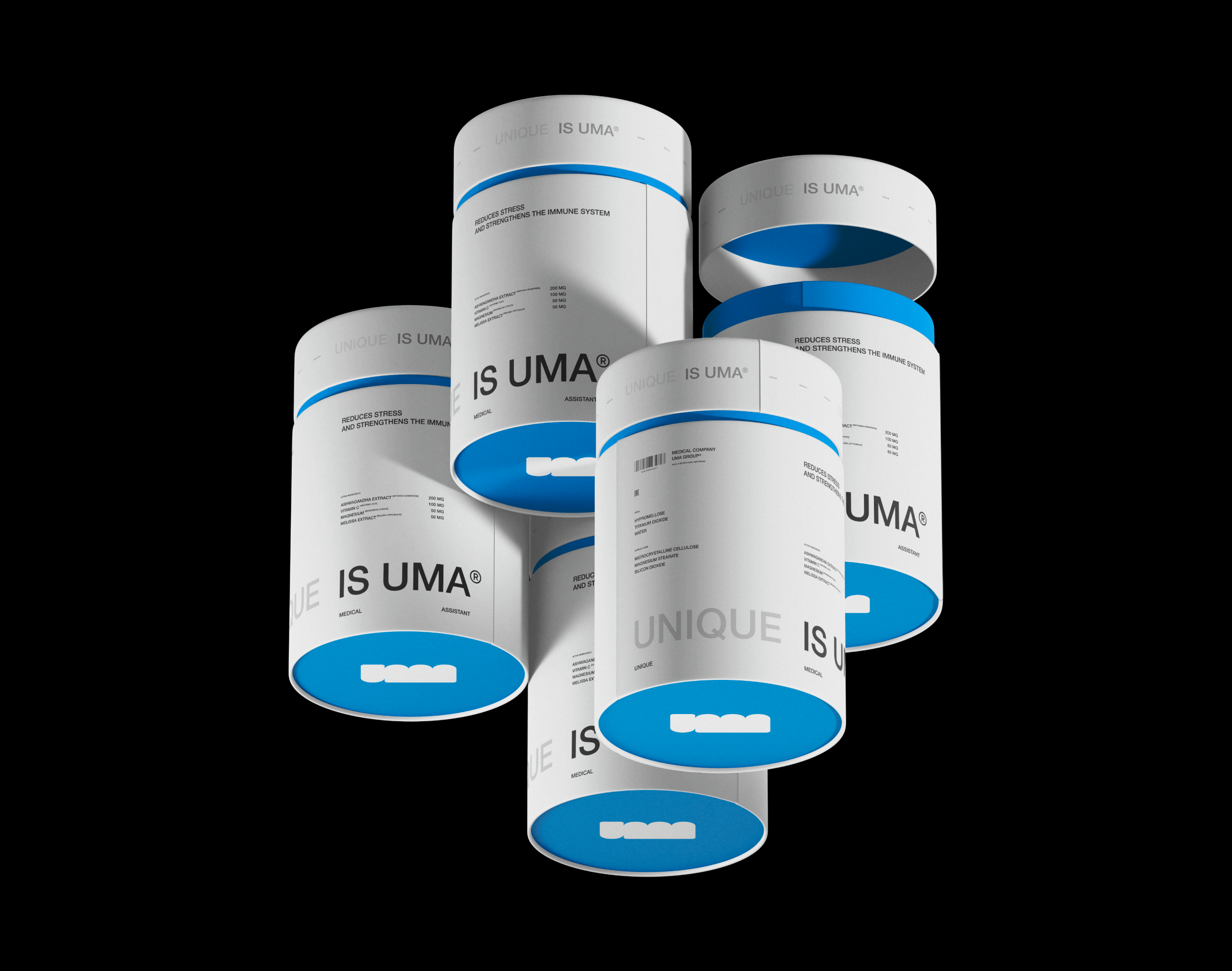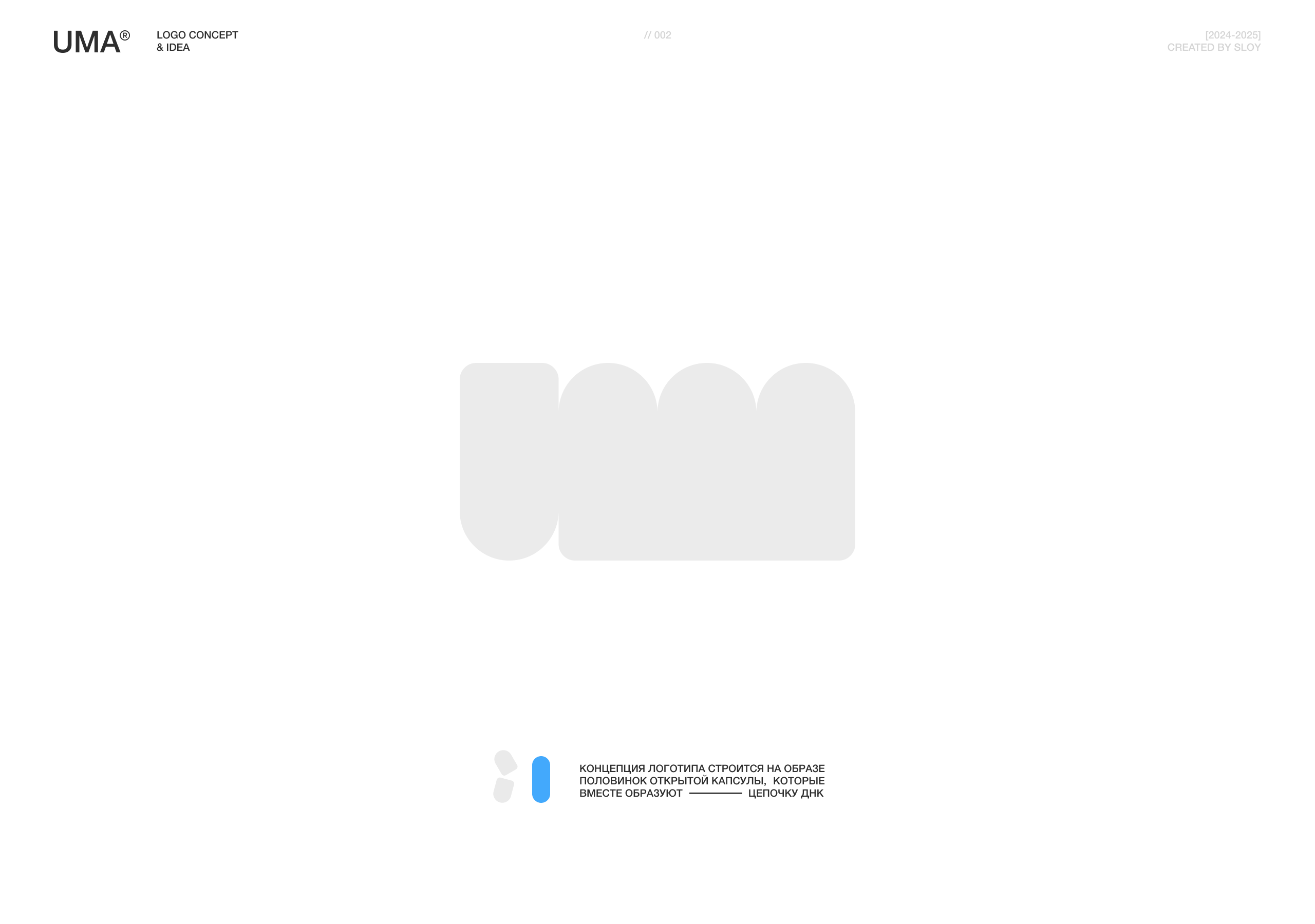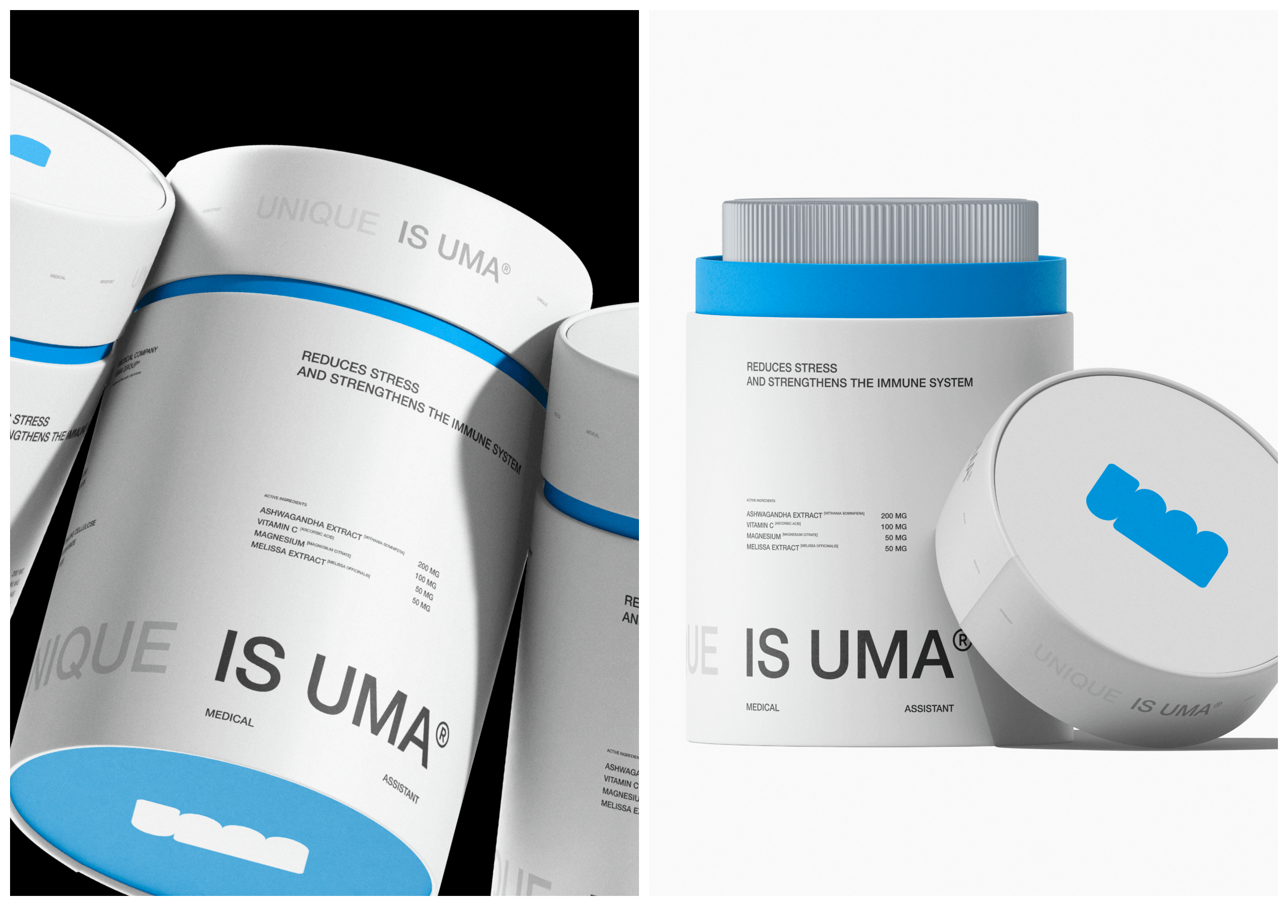 Логотип вдохновлен образом капсулы и цепочки ДНК. По легенде бренда: UMA — это современные лекарства, представленные в виде капсул в элегантной банке.