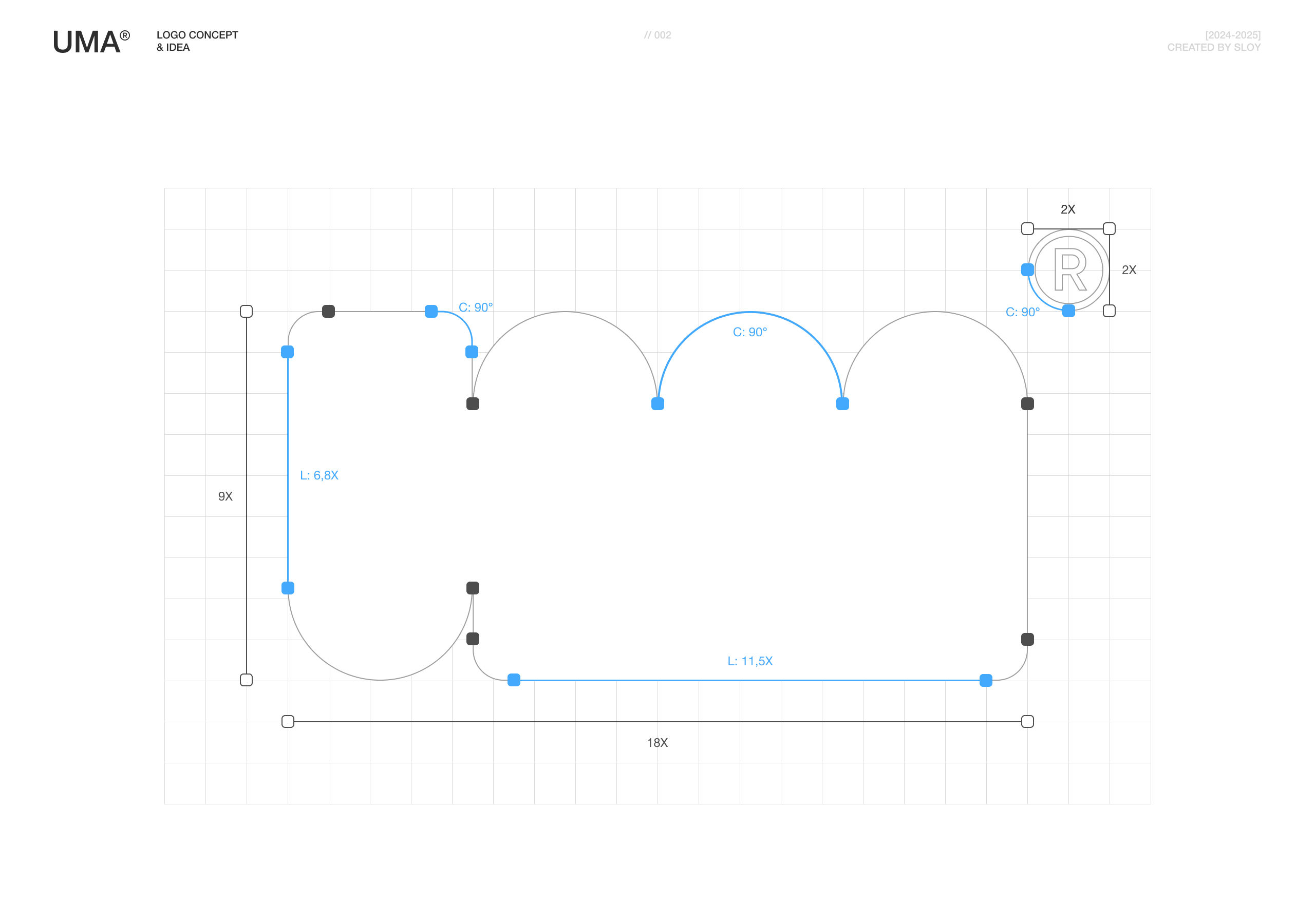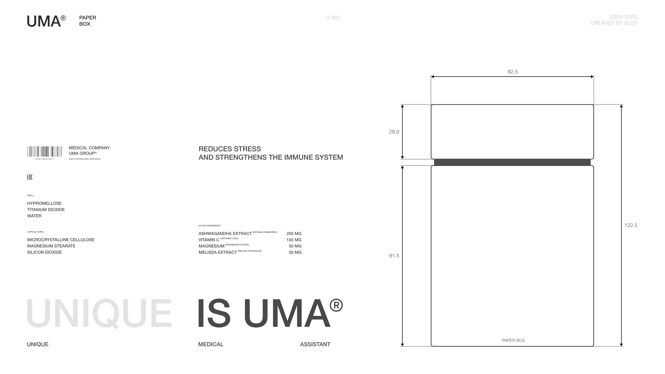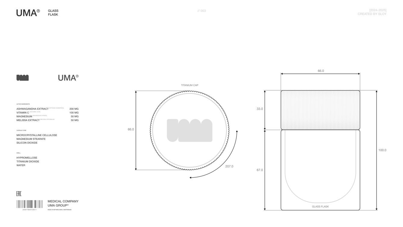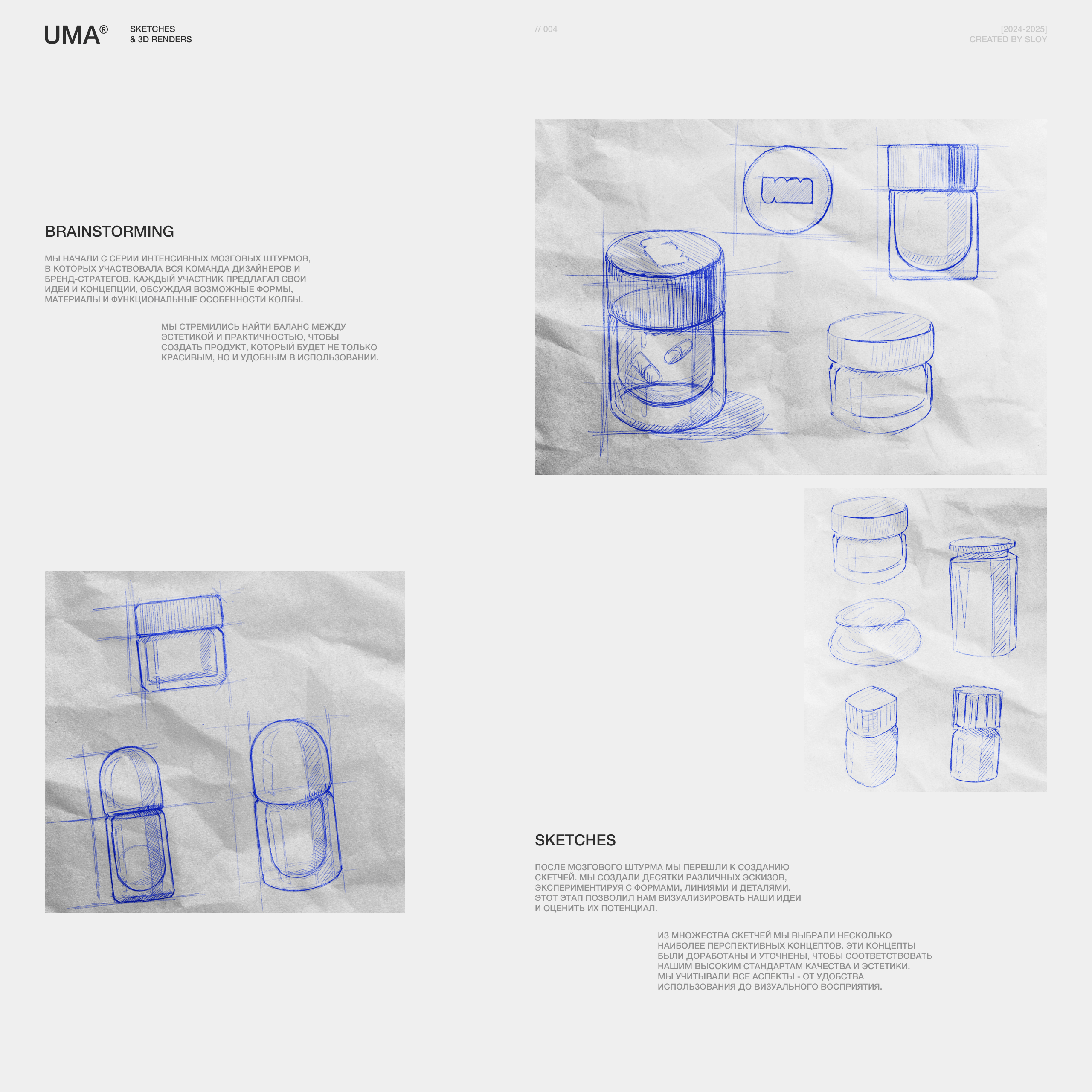 Логотип вдохновлен образом капсулы и цепочки ДНК. По легенде бренда: UMA — это современные лекарства, представленные в виде капсул в элегантной банке.