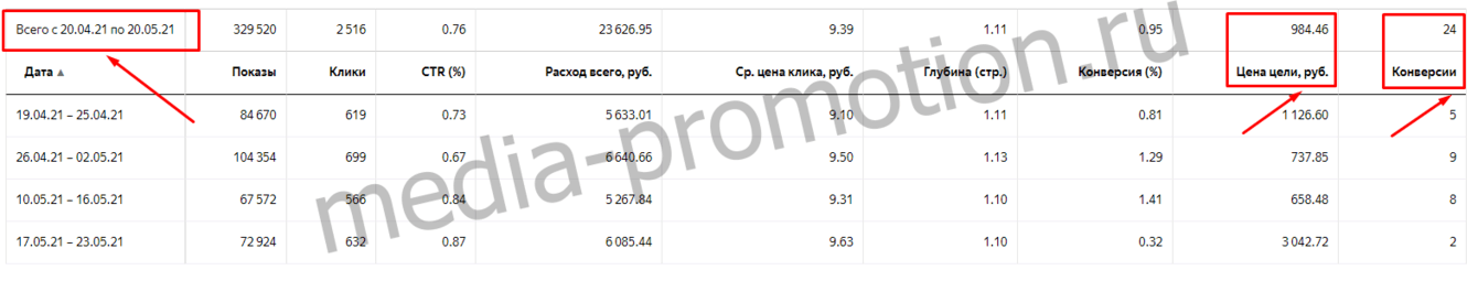 После грамотной настройки рекламы Яндекс Поиск + Рся с 20 апреля по 20 мая на сайт пришли 24 заявок по 980 рублей.