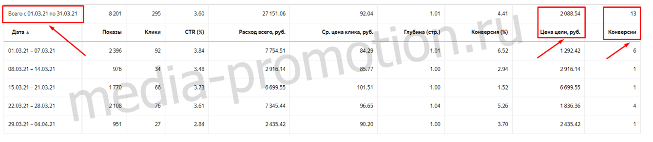 В период с 1 по 30 марта было - 13 заказов по 2100 рублей и было принято решение проверить эффективность всей комплексной работы маркетинга, а именно работу и адаптивность сайта, а потом уже настраивать на него рекламу в Яндексе.