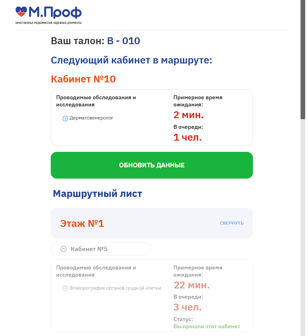 - Регистратура. Посетитель получает талон с QR-кодом вместо обходного листа и номер первого кабинета в маршруте.