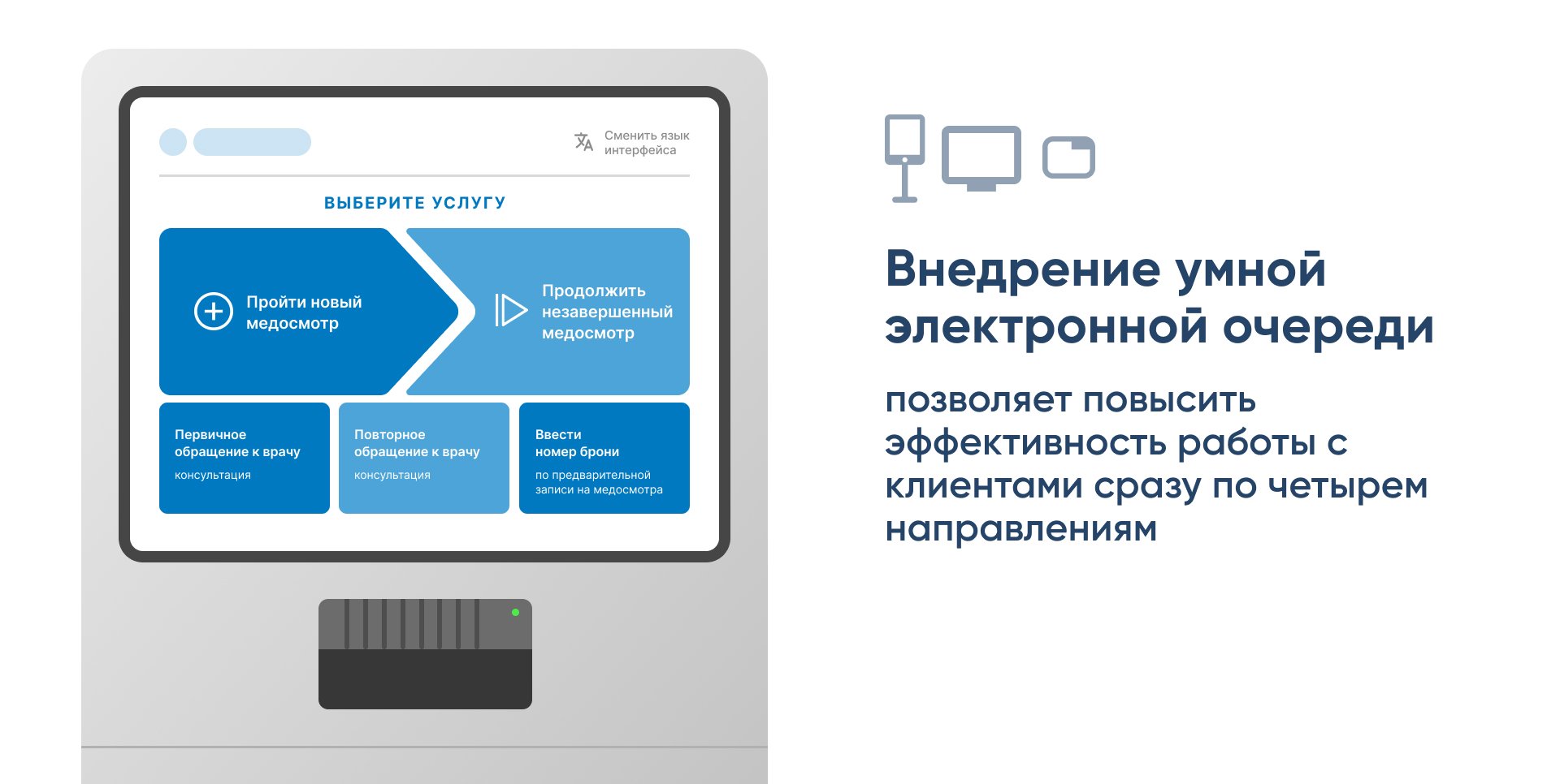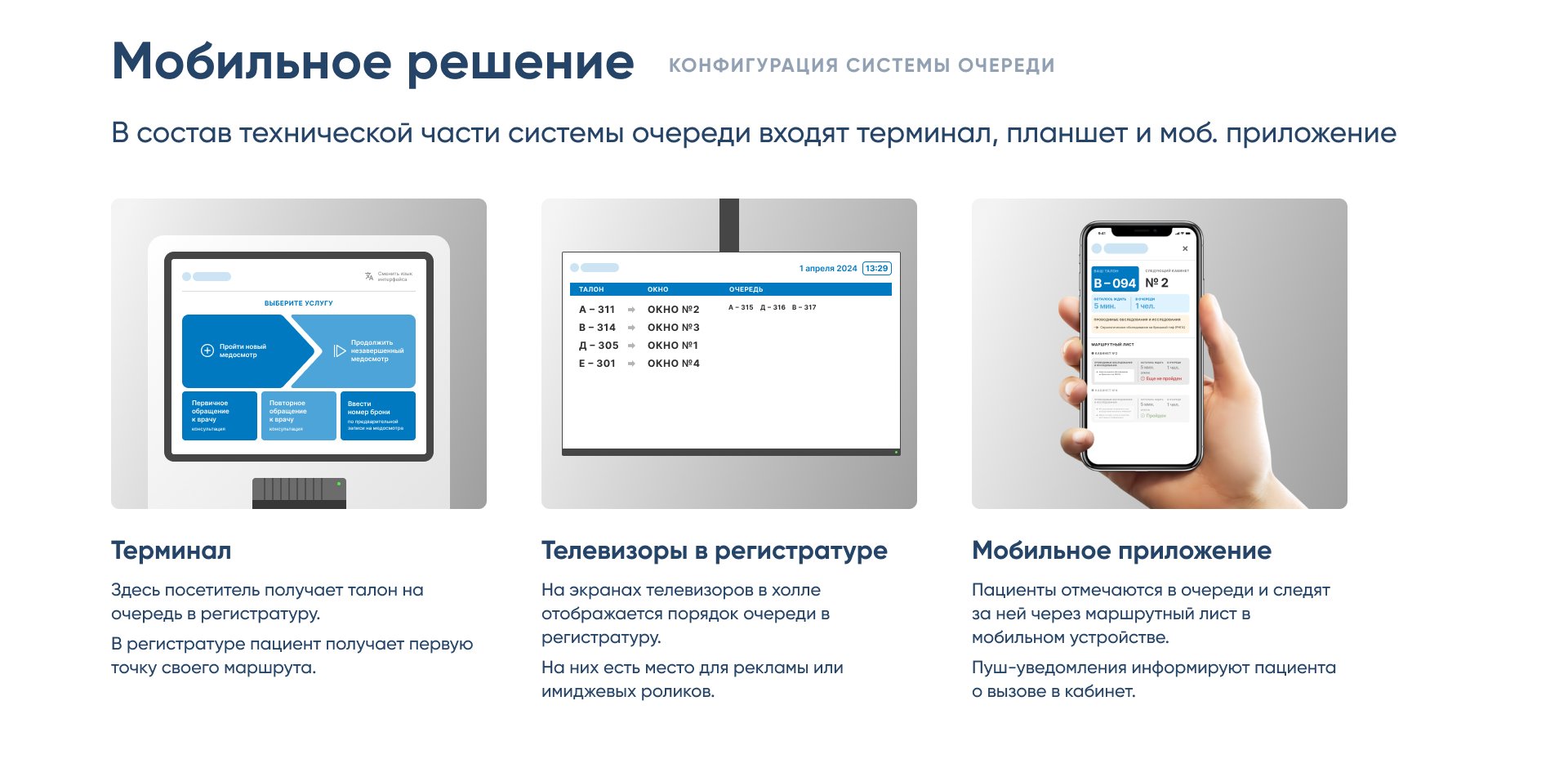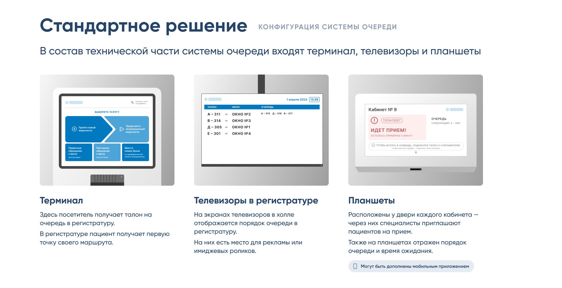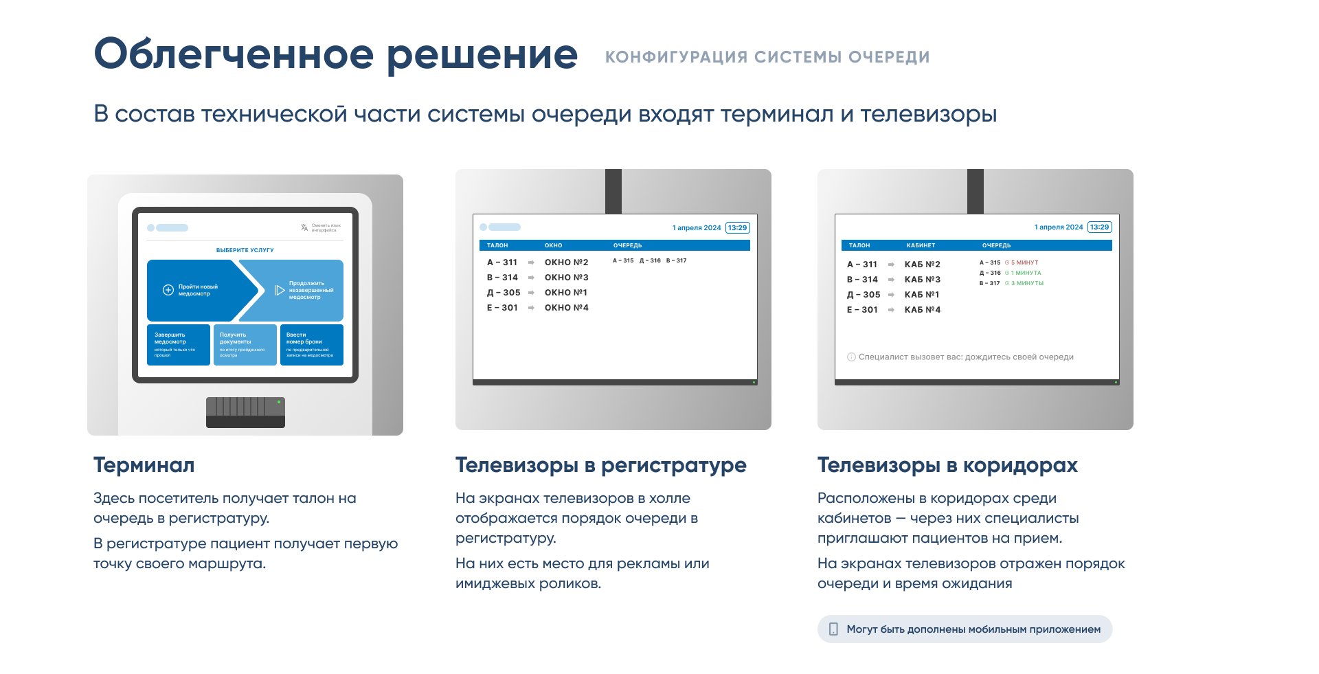 Дополнительно учли интеграцию с терминалами, планшетами и телевизорами, чтобы предложить несколько конфигураций — от классической электронной очереди до мобильного решения.
