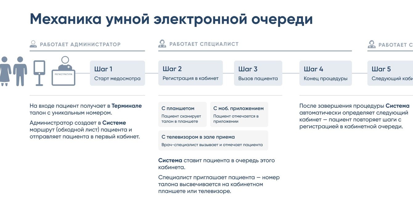 — врачи не выходят в коридор — система автоматически вызывает пациентов через планшеты, телевизоры или мобильное приложение.