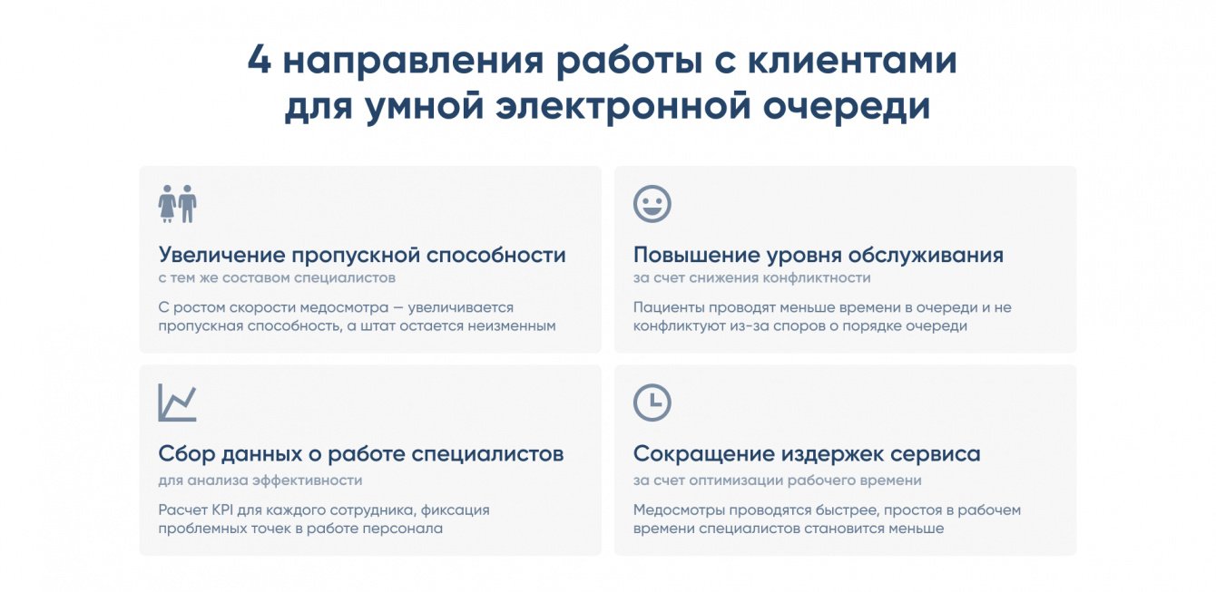 — увеличивает пропускную способность — поток пациентов перераспределяется так, что медосмотр проходит быстрее, а клиника может принять больше посетителей без увеличения штата.