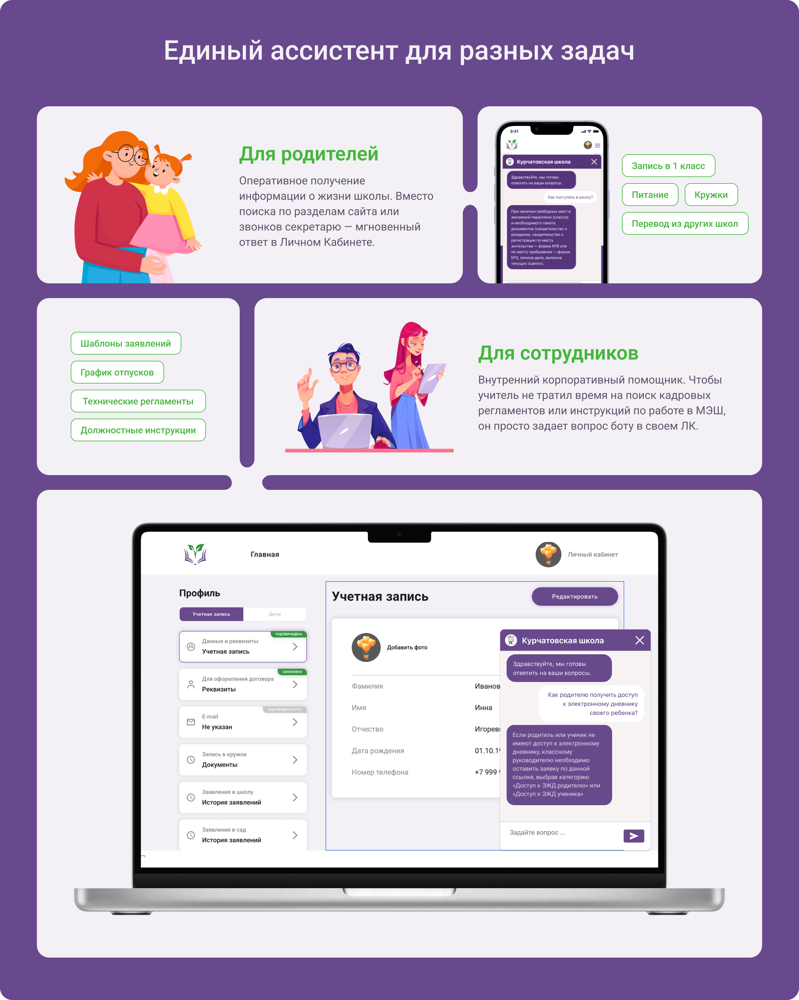 1. Экосистема «в одном окне»: Пользователям не нужно скачивать новые приложения или переходить в мессенджеры. Ассистент встроен прямо в Личный Кабинет на сайте школы — это привычно, безопасно и удобно.
