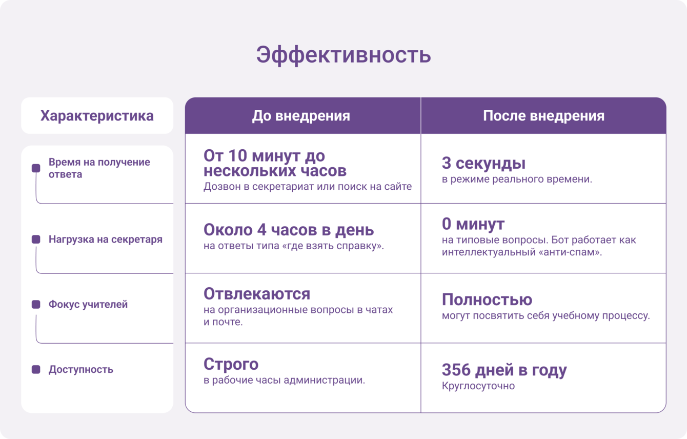 Необходимо создать единую точку доступа к информации, которая работала бы 24/7, понимала живой язык пользователей и была интегрирована в существующую цифровую среду школы.