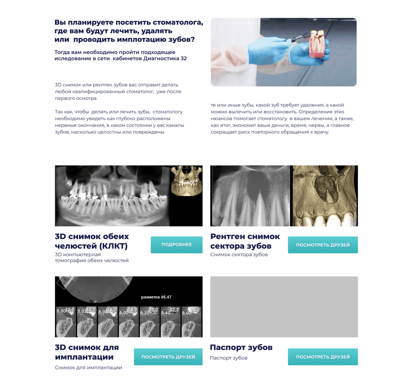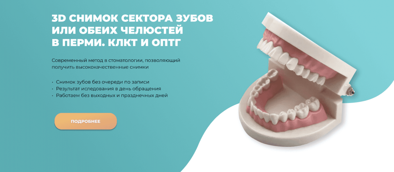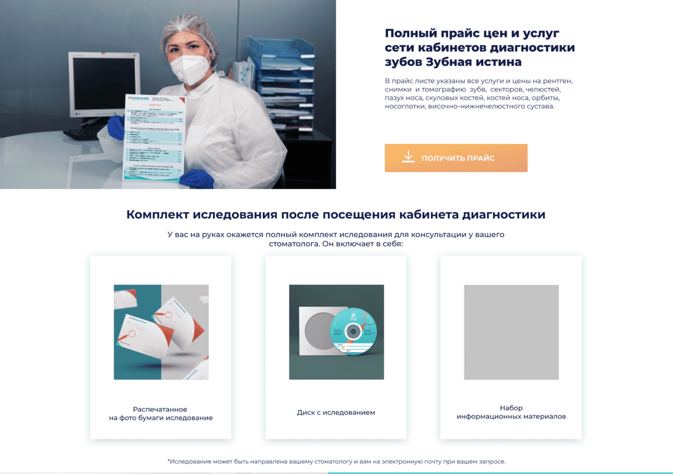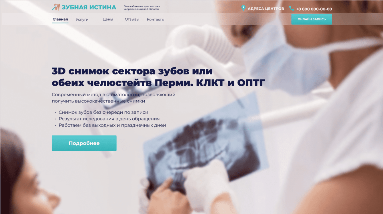 Клиент – сеть стоматологических кабинетов «Зубная истина». Компания специализируется на диагностике черепно-лицевой области и 3D-снимках секторов зубов. "Зубная истина" занимается подготовкой к лечению, удалению и имплантации. В отличие от конкурентов, наш Заказчик делает 3D-снимок или рентген уже после первого осмотра.
