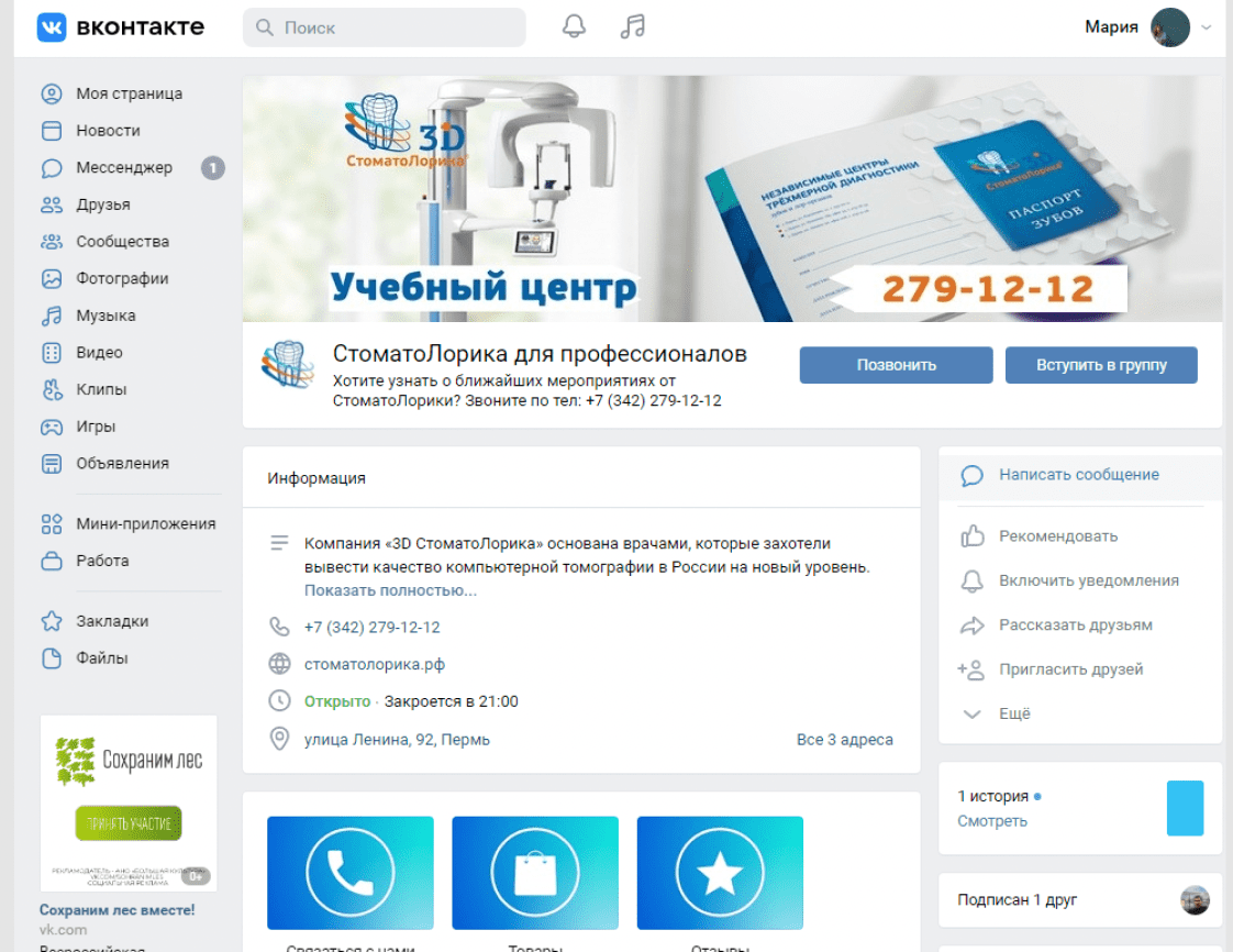 Проработали контактный блок: добавили основной адрес, общий телефон и электронную почту. Поместили ссылки на профили в социальных сетях.