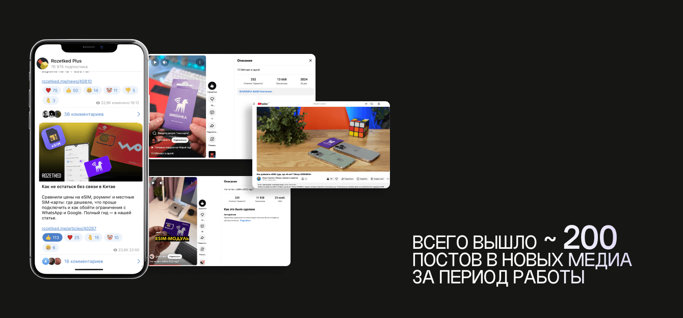 Мы не ограничивались стандартными постами. Мы запускали полноценные пошаговые обзоры в профильных техно-изданиях, где эксперты не просто хвалили, а тестировали, разбирали на части, сравнивали и показывали на пальцах, как работает Unisimka. Даже критика шла в плюс — она усиливала доверие.