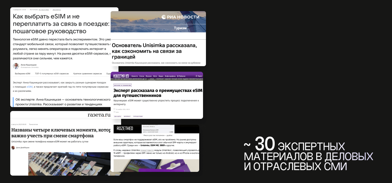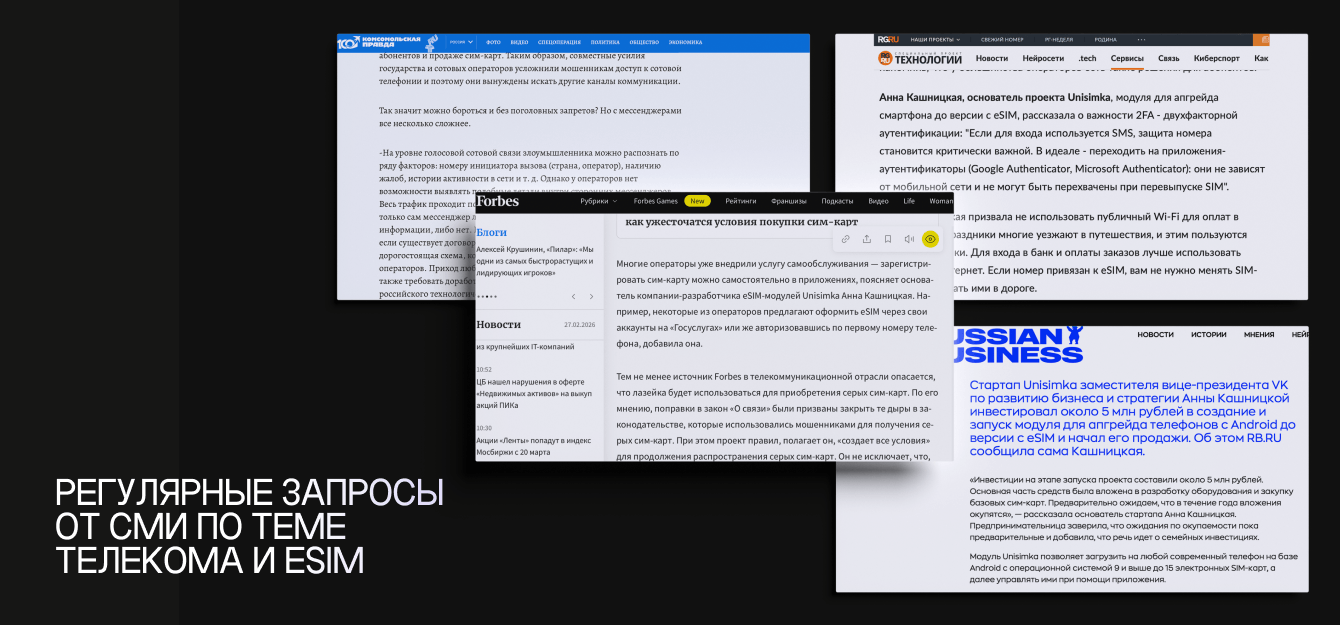Мы формировали повестку через экспертизу и лицо проекта — Анну Кашницкую, основательницу Unisimka. Мы вывели ее на передовую деловых и технологических медиа, где она начала говорить от лица всей индустрии eSIM.