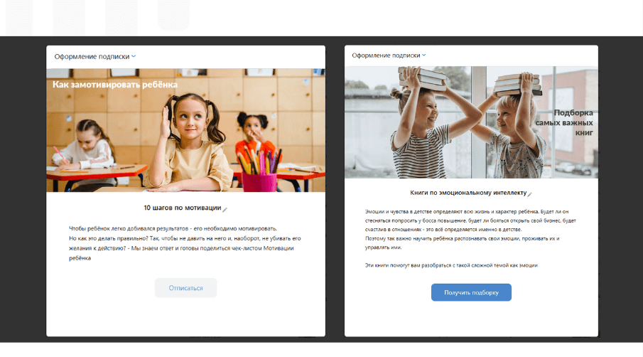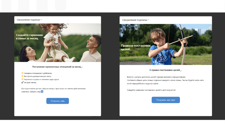 У нас есть 4 лид-магнита. Все они находятся в меню, ссылки которого ведут на страничку подписки в сенлер. Каждую страничку подписки мы оформили: