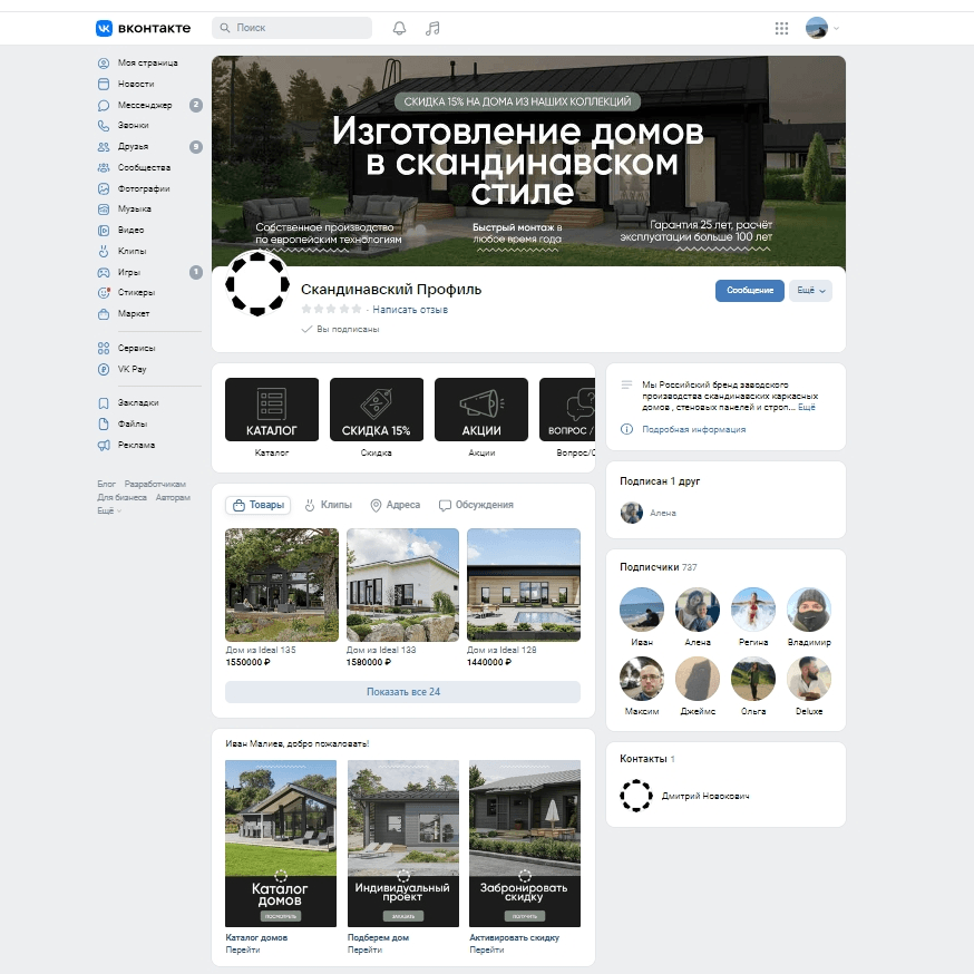- Акции — подписная страница senler. Собирая базу клиентов, мы сможем высылать скидки и акции.