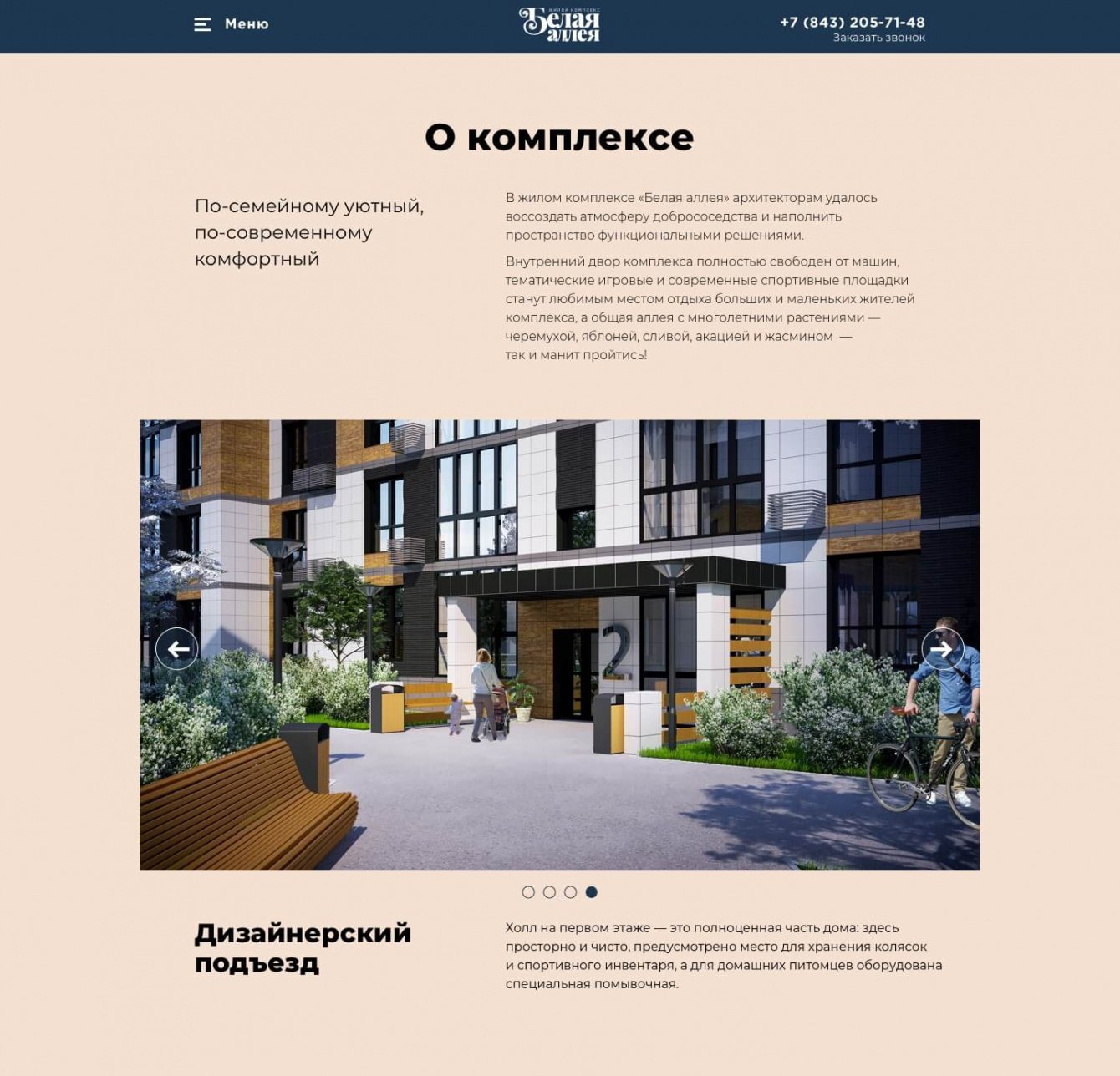 Позиционирование жилого микрорайона «Белая аллея» основывается на идее добрососедства. А большая прогулочная зона с цветущими деревьями стала основой концепции и отличительной чертой комплекса.