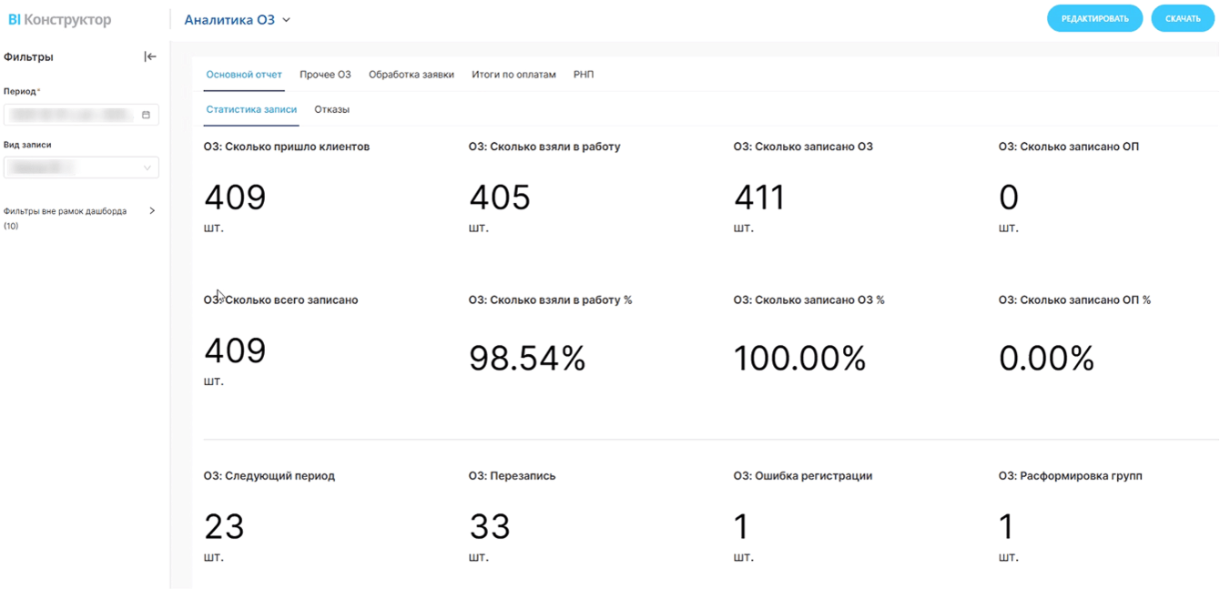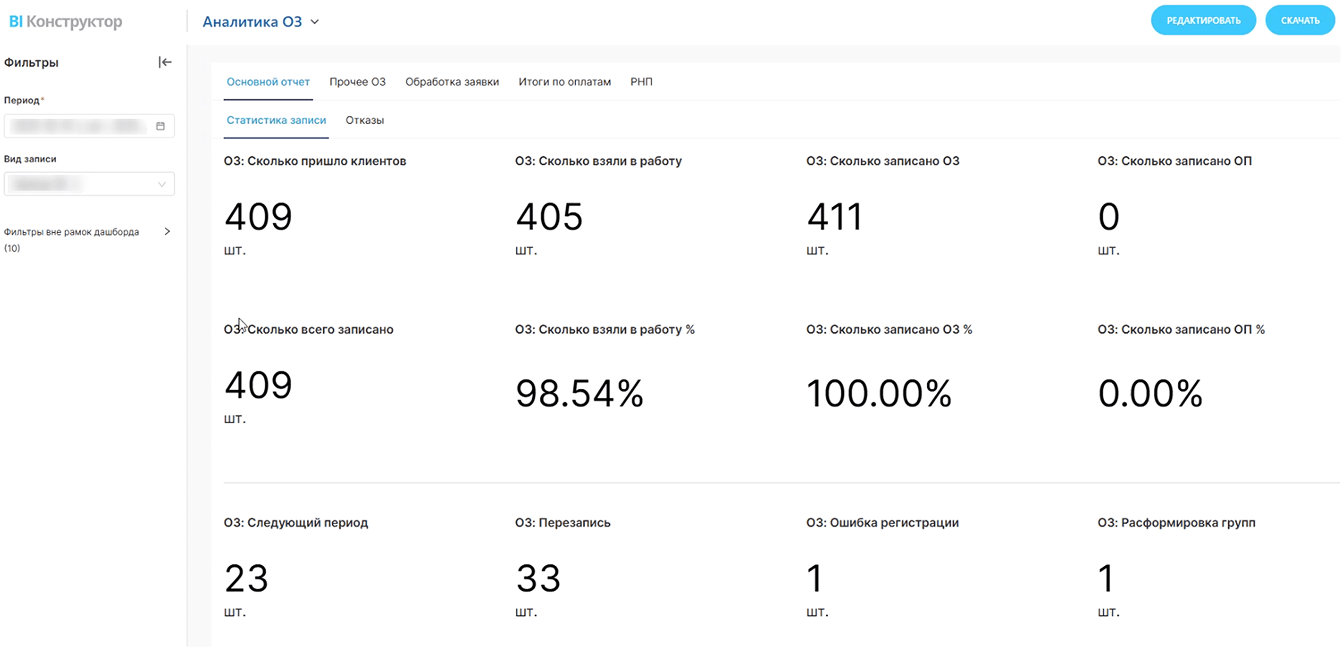 У клиента есть несколько воронок по отделам, например, воронка продаж, адаптации, записи, доведения и т.п. Мы разработали кастомные отчеты и настроили фильтрацию по нужным показателям для каждого отчета.