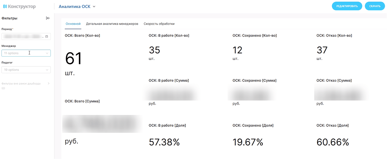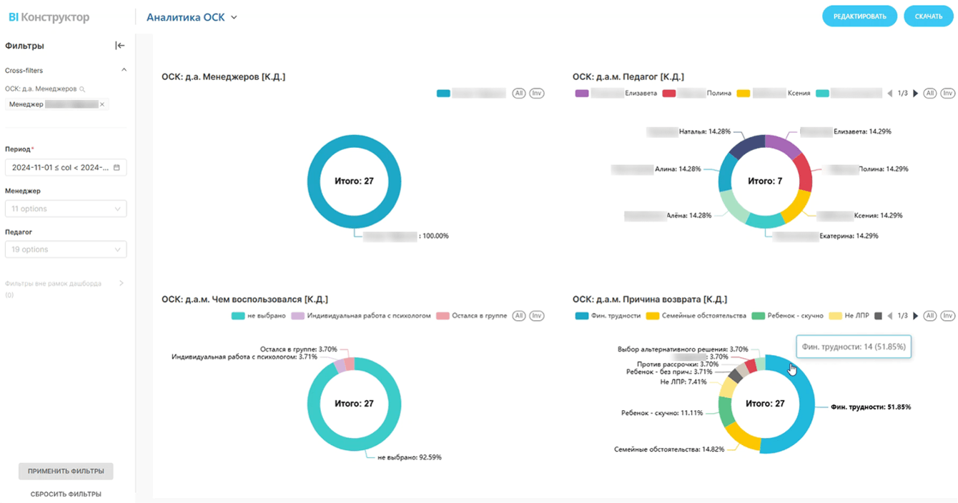Производительность конкретных менеджеров и педагогов — какой менеджер или педагог чаще сталкивается с отказами.