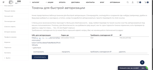 6) В итоге в ЛК пользователя появился функционал Токенов для быстрой авторизации, с возможностью деактивации, продления срока действия и полного удаления