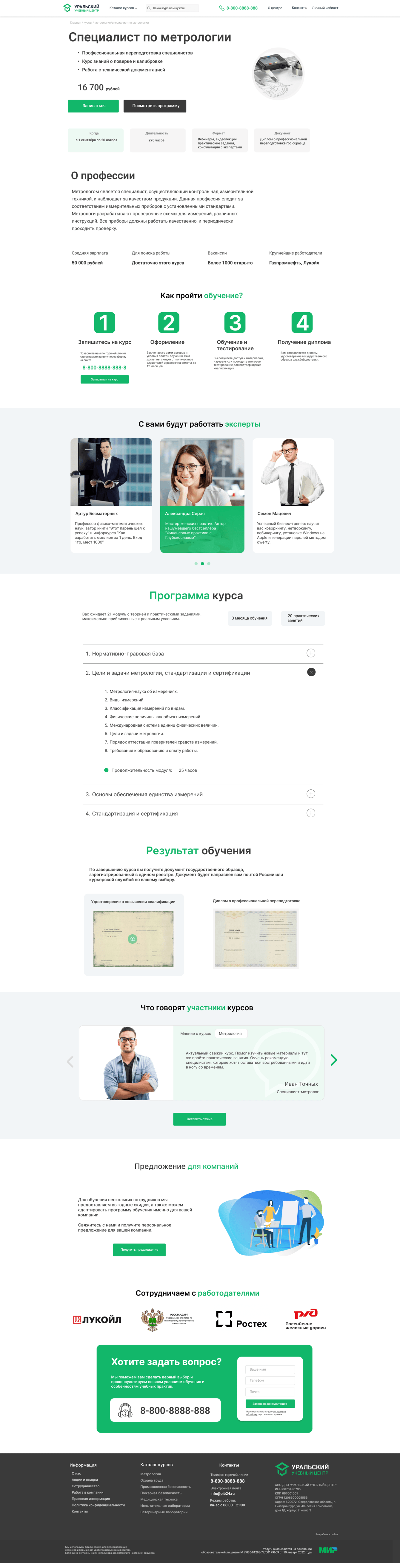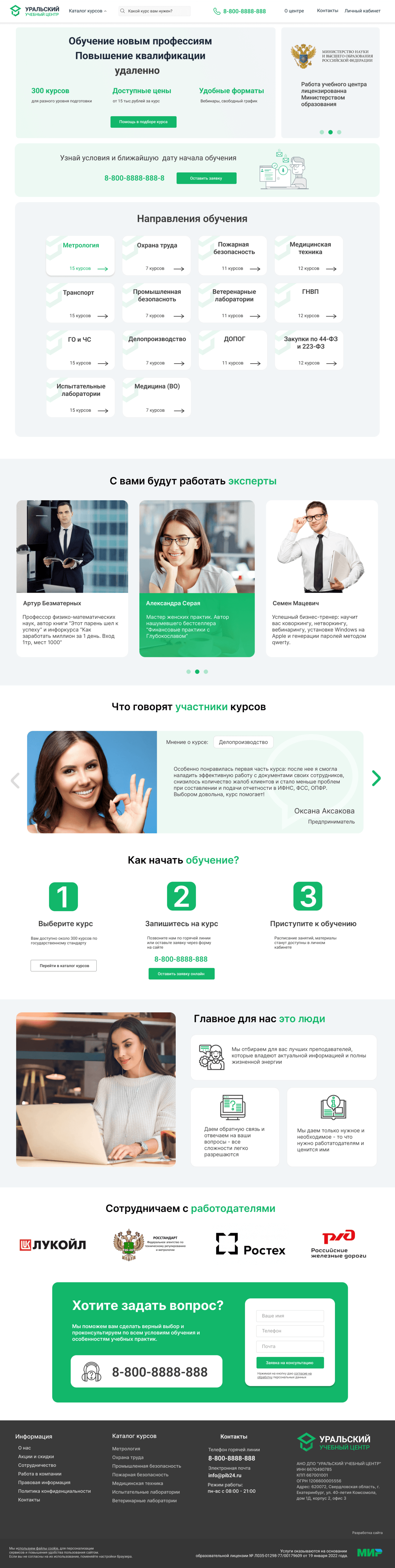 Мы приняли решение использовать спокойный зеленый цвет в дизайне и логотипе и дать понятные для любого уровня пользователей экраны: основную информацию о центре, каталог курсов, лицензии, отзывы, пруфы от компаний, CTA и меню с поиском. Основной же посадочной страницей будет страница курса - в которой буду дана исчерпывающая информация для принятия решения о его покупке.